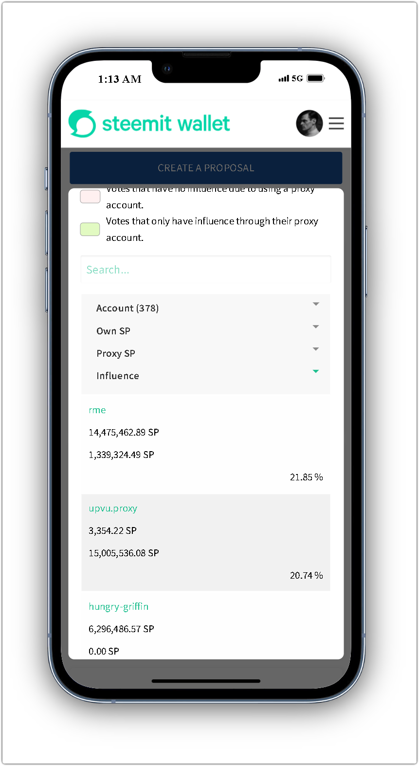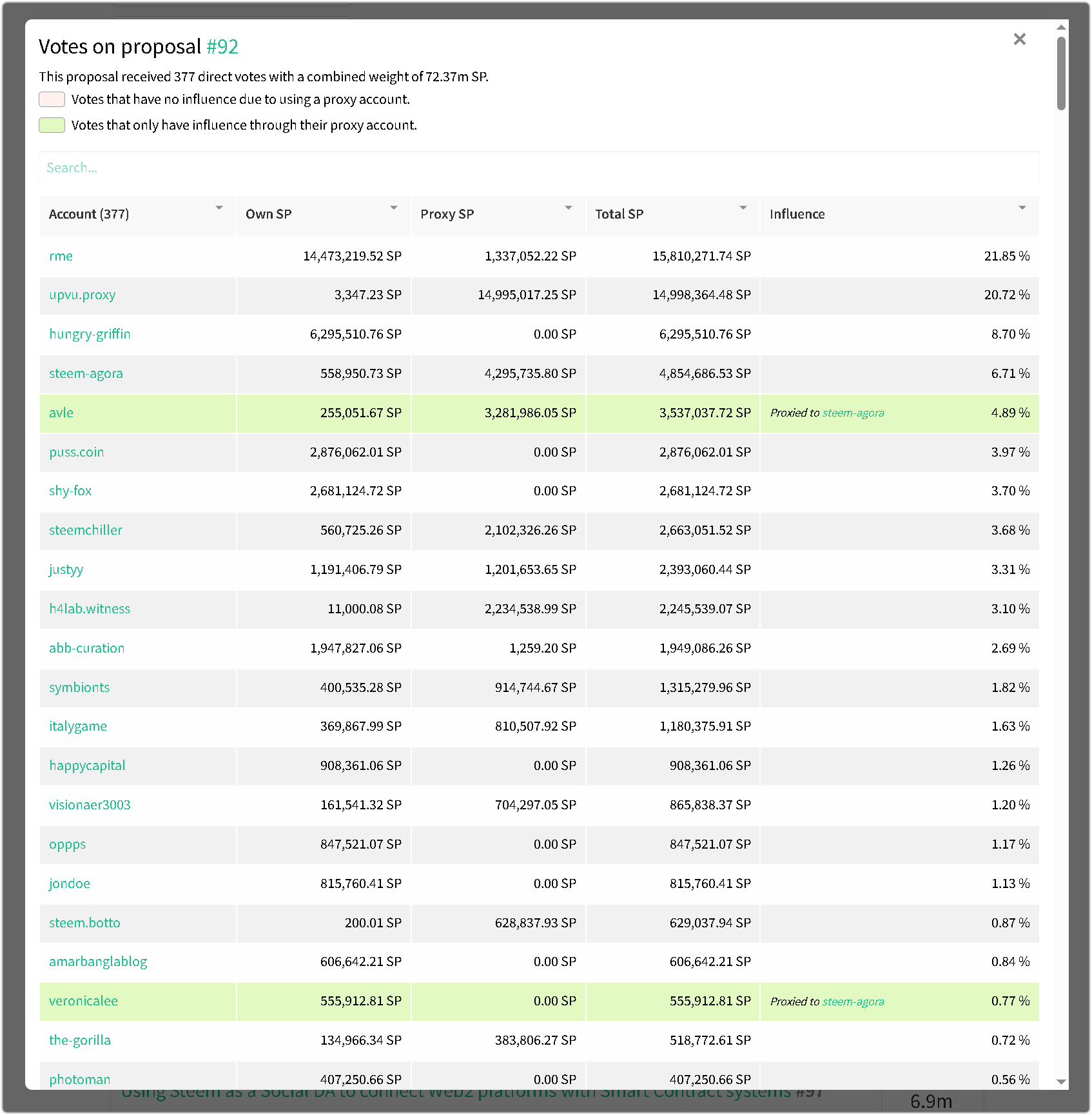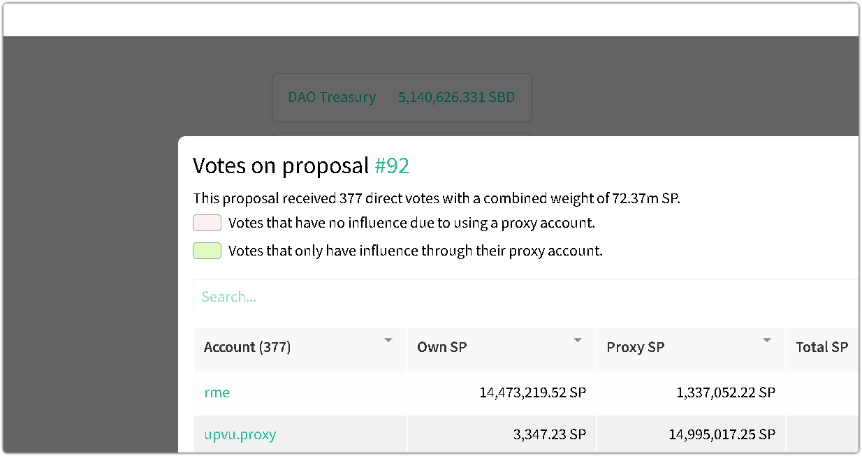 As outlined above, users who wish to view the support level for proposals that have not yet commenced can click on the "0" value. This action will display detailed information, including the actual support for the proposal and a comprehensive list of all voters. Additional data is also presented, such as the Steem Power held by each voter, their proxied voting power, and the overall influence of each account. A search bar has also been added to help users quickly locate specific accounts, and the table now includes functionality to sort and rank entries as needed.