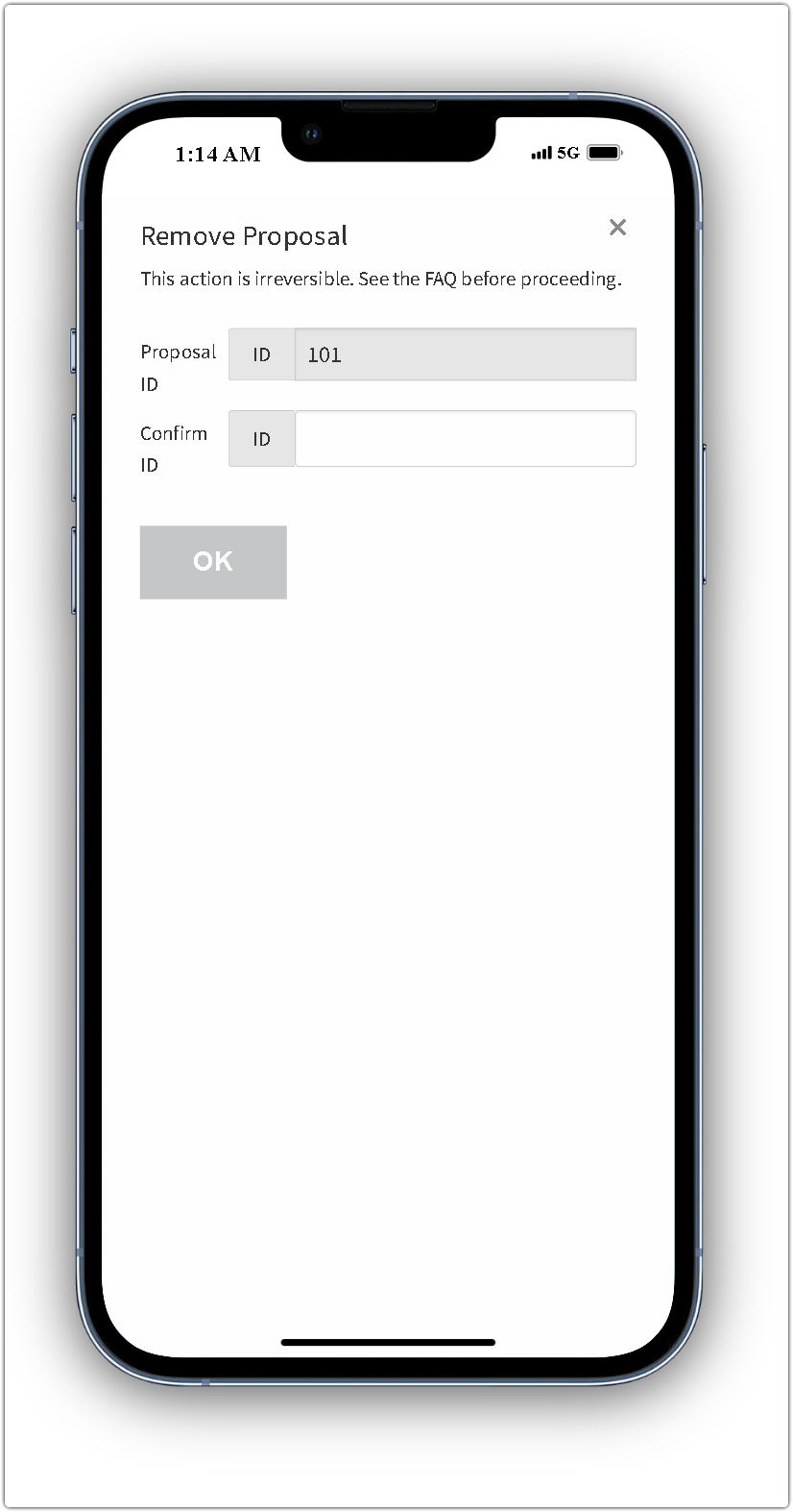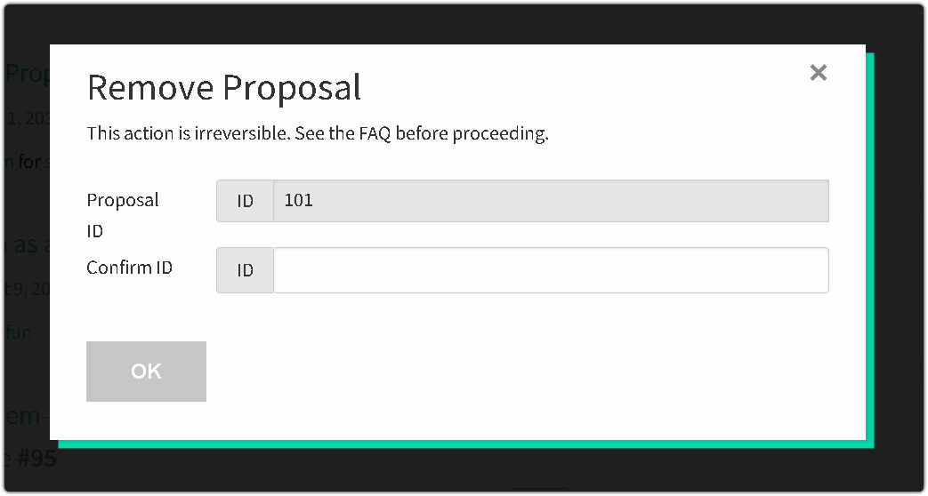 To address this issue, we have implemented an additional security mechanism to ensure that users are fully aware of their actions. This safeguard helps prevent accidental removals caused by muscle memory or confusion with similar interface elements. Users are now required to re-enter their proposal ID before they can proceed with the removal.