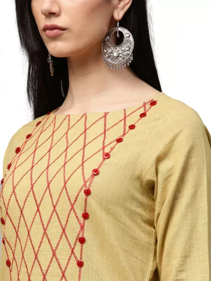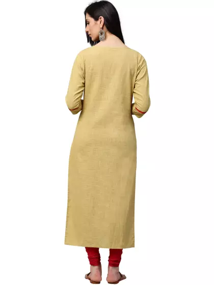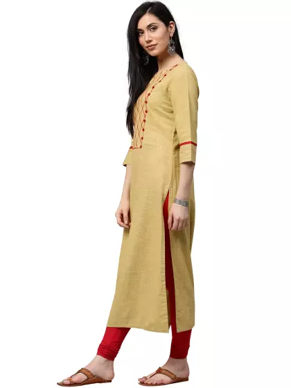 Beige Solid Print Embroidered Button Detail Straight Fit Cotton Slub Kurta