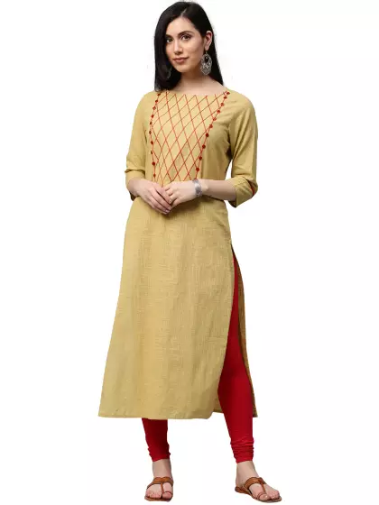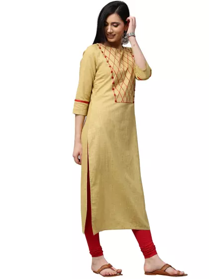 Jaipur Kurti Women's Beige Solid Print Cotton Slub Kurta. This Straight fit Cotton Slub kurta has Plain pattern with Embroidery & Button Detail, 3/4th sleeves with Round Neck.