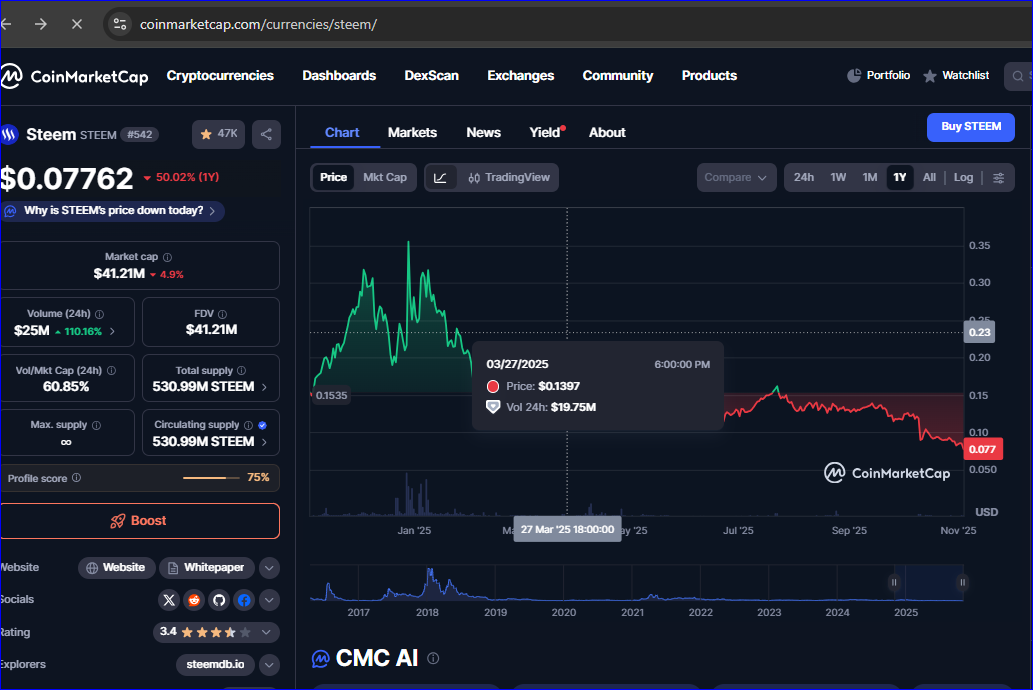 Now, why are these two tokens so cheap? Have huge whales been offloading big amounts of these tokens? Or is it just that crypto social networking has run its course? This would be tough for me and thousands of other people. For me because this is actually the only online endeavor that has ever given me any money and I would miss that. But it looks like something is very wrong with these tokens, the crypto market cap is huge and it does have its ups and downs but Steem and Hive have had a constant down all this year. I think a lot of money has been taken out. The
