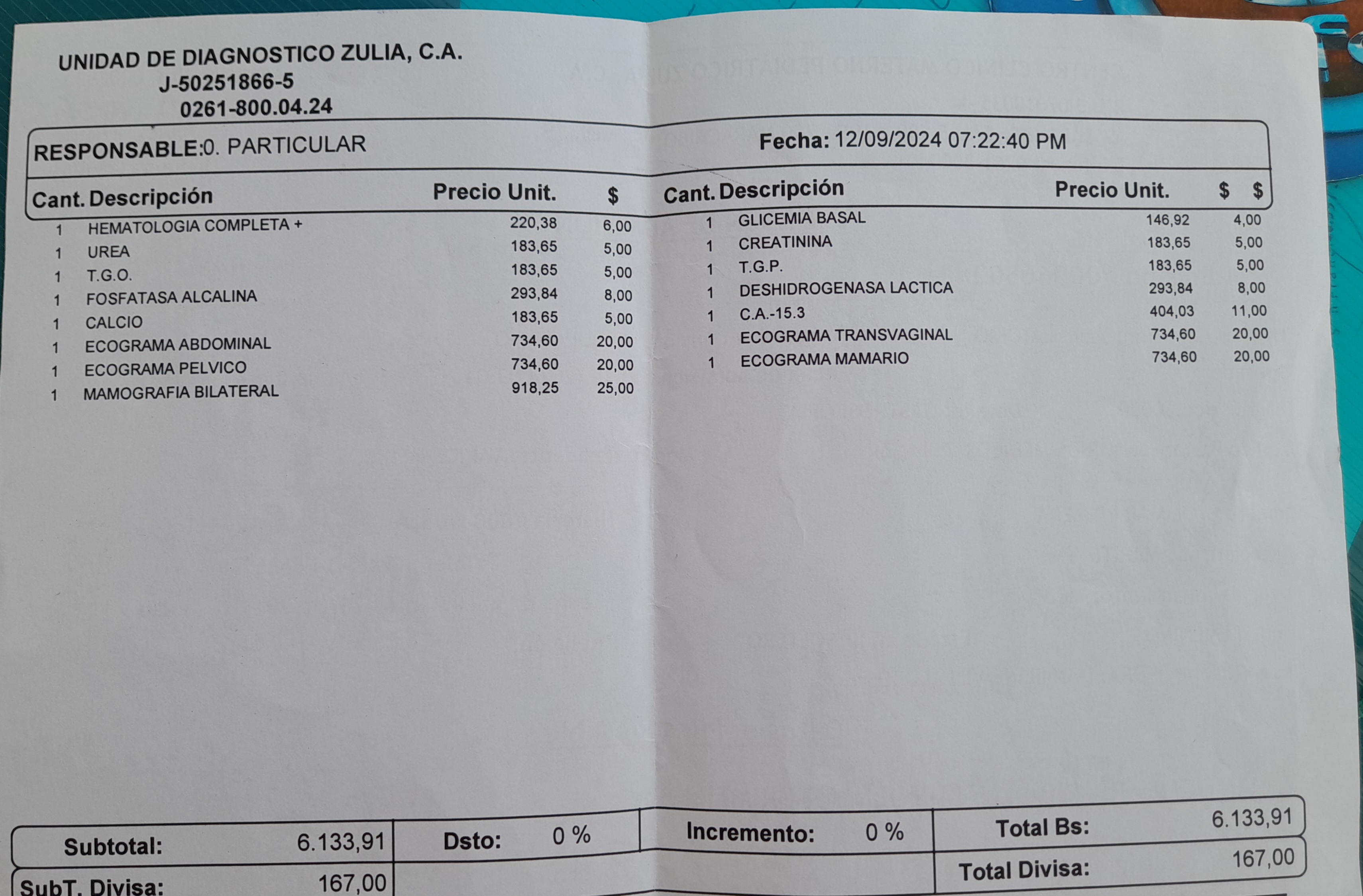 I still have many tests to do, such as an abdominal, vaginal, transvaginal ultrasound, chest x-ray, ultrasound, and some blood tests. All of this has a cost of 167 dollars as you see in the budget, but I know that my God will continue to help me as He has done so far, I have no doubt about that.