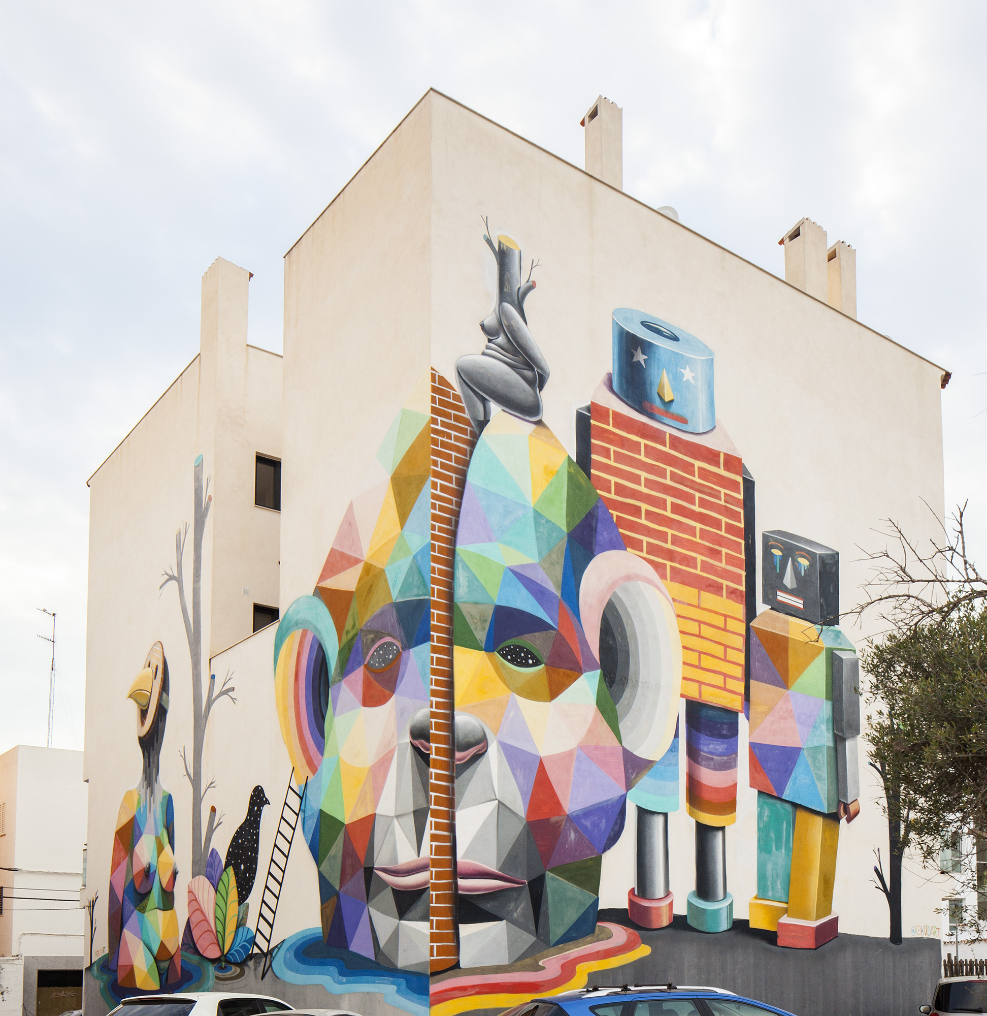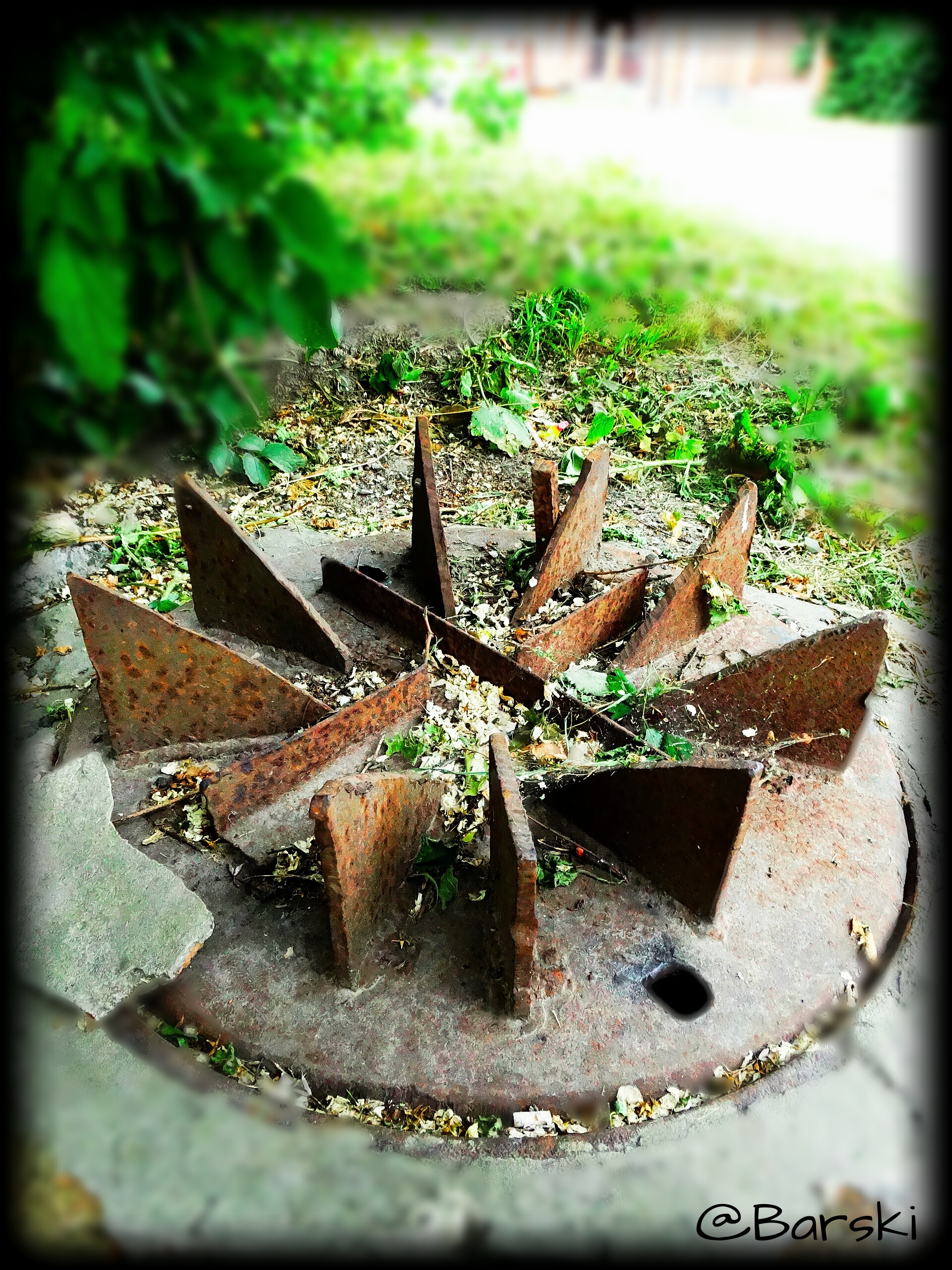 Very angular artisanal decoration for one of the parts of the movie "Mad Max" apparently which, in combination serves as a cover for a sewer well.