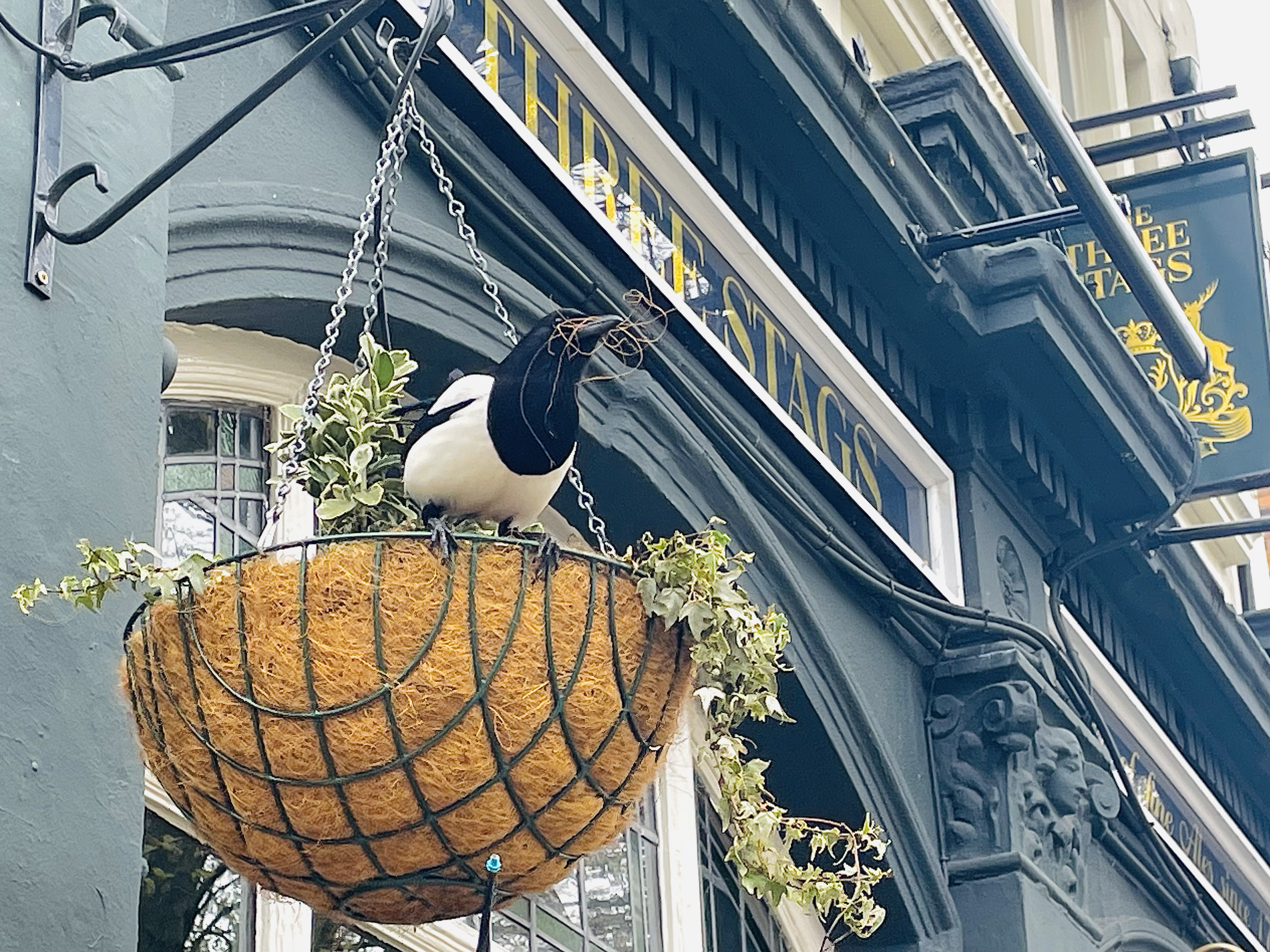 Magpie gathers nesting material from the pub’s flower hanging baskets.