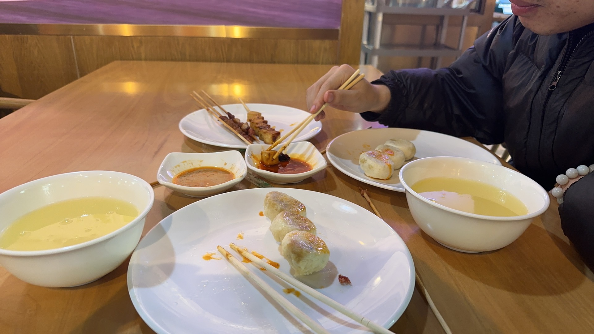 For dinner, we ate in the company canteen and ordered steamed buns and kebabs.