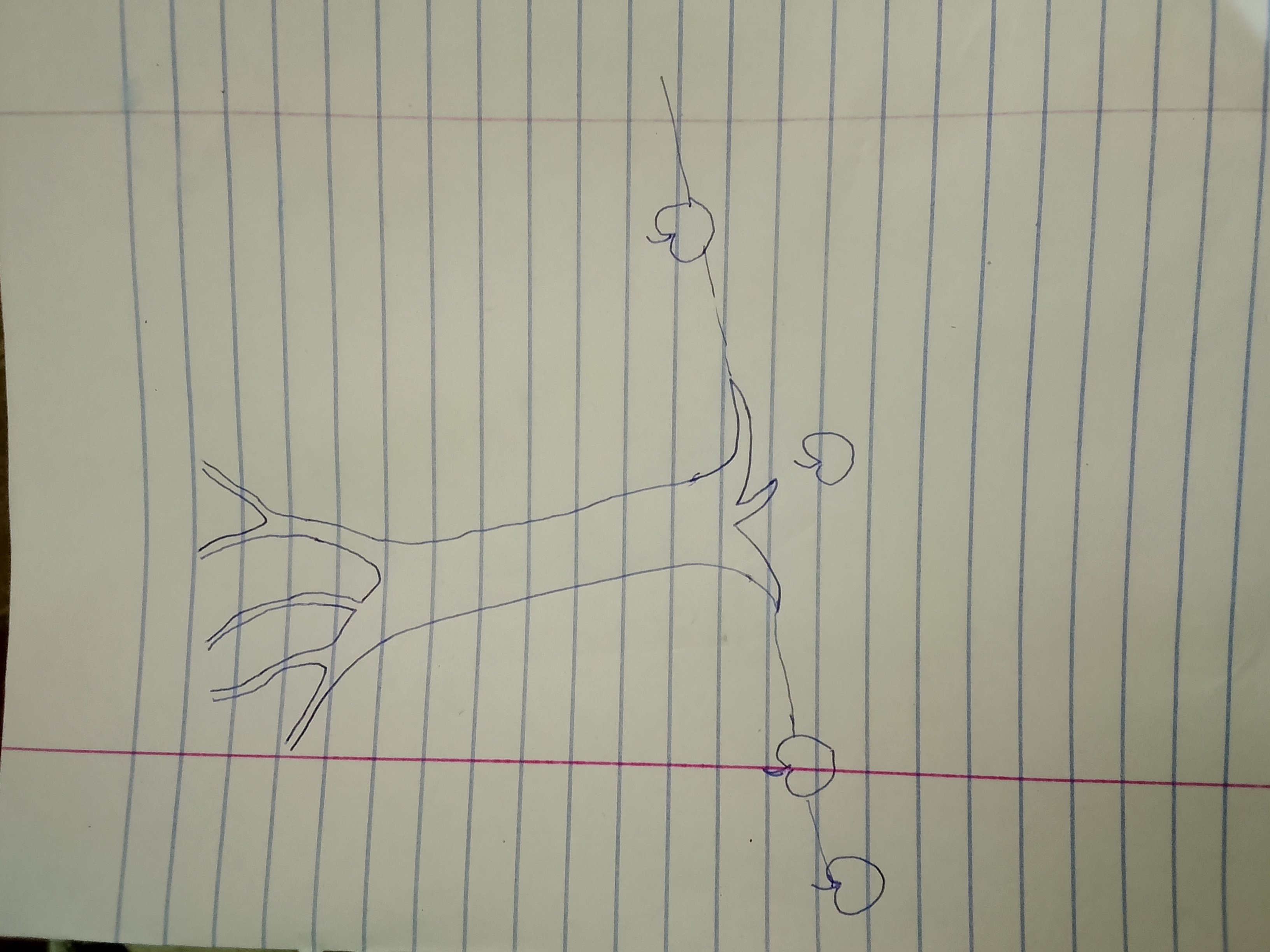At the top of the trunk I drew the branches spreading out. Each branch is like the letter Y. The branches go outward and upward.. I drew about three or four main branches.