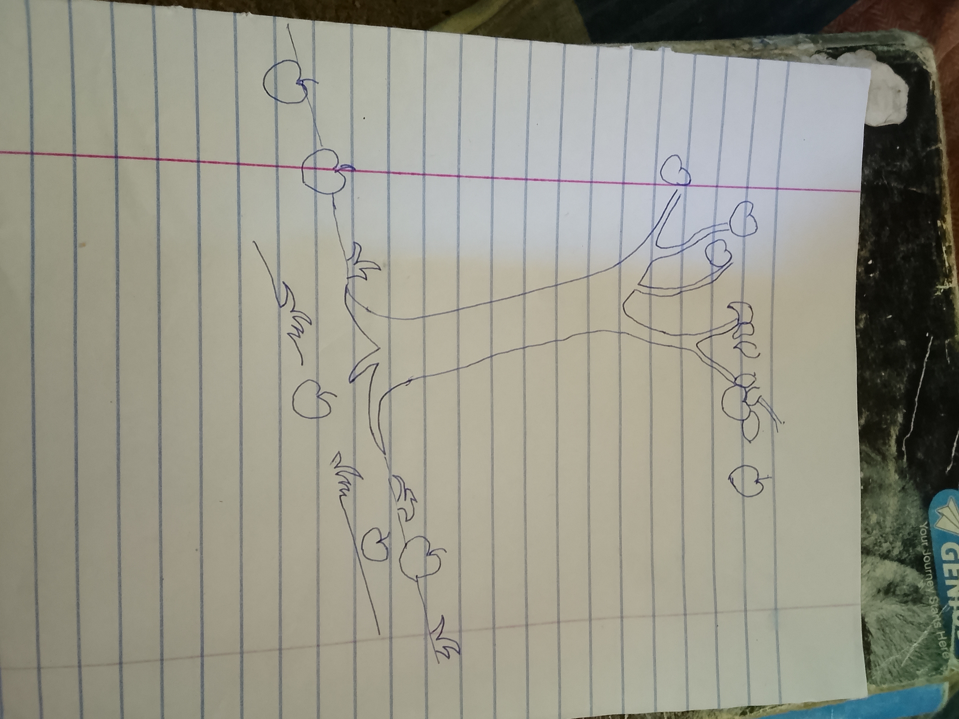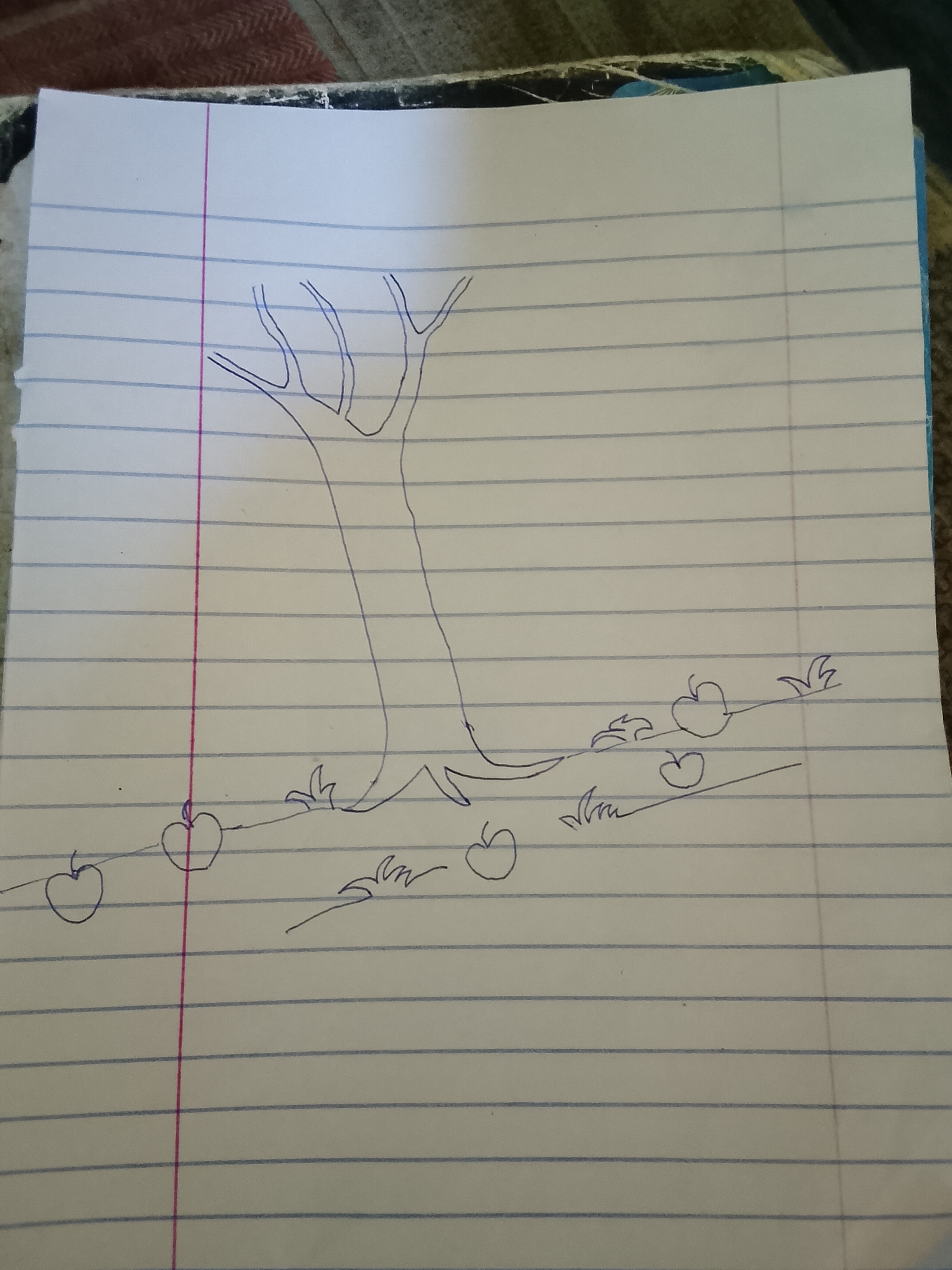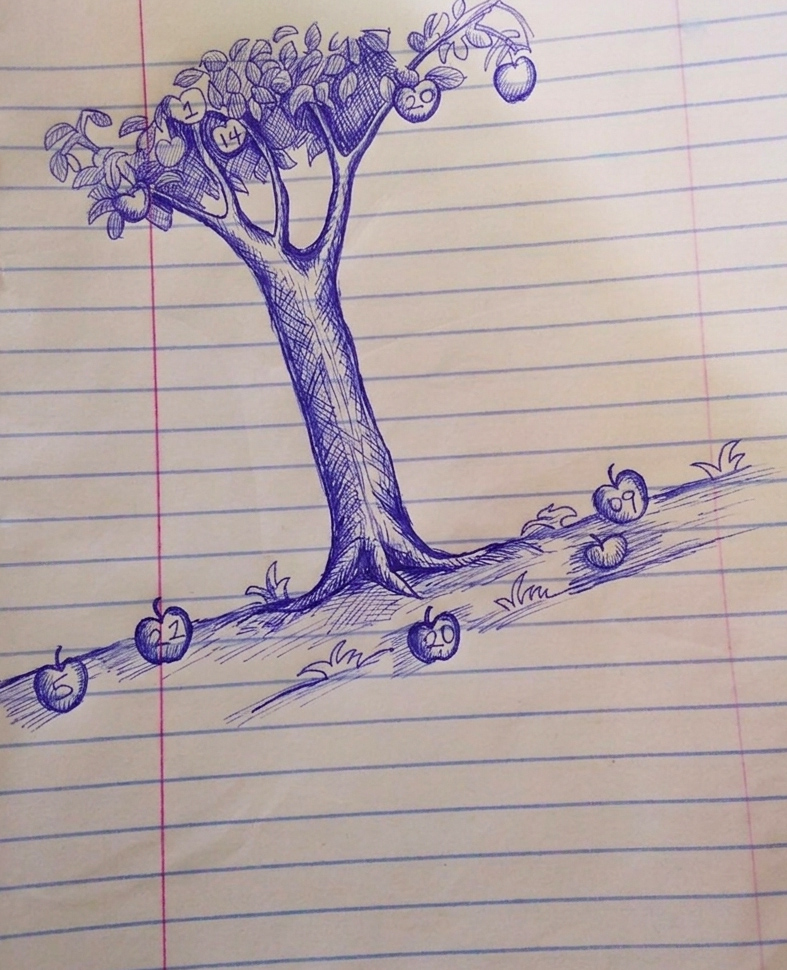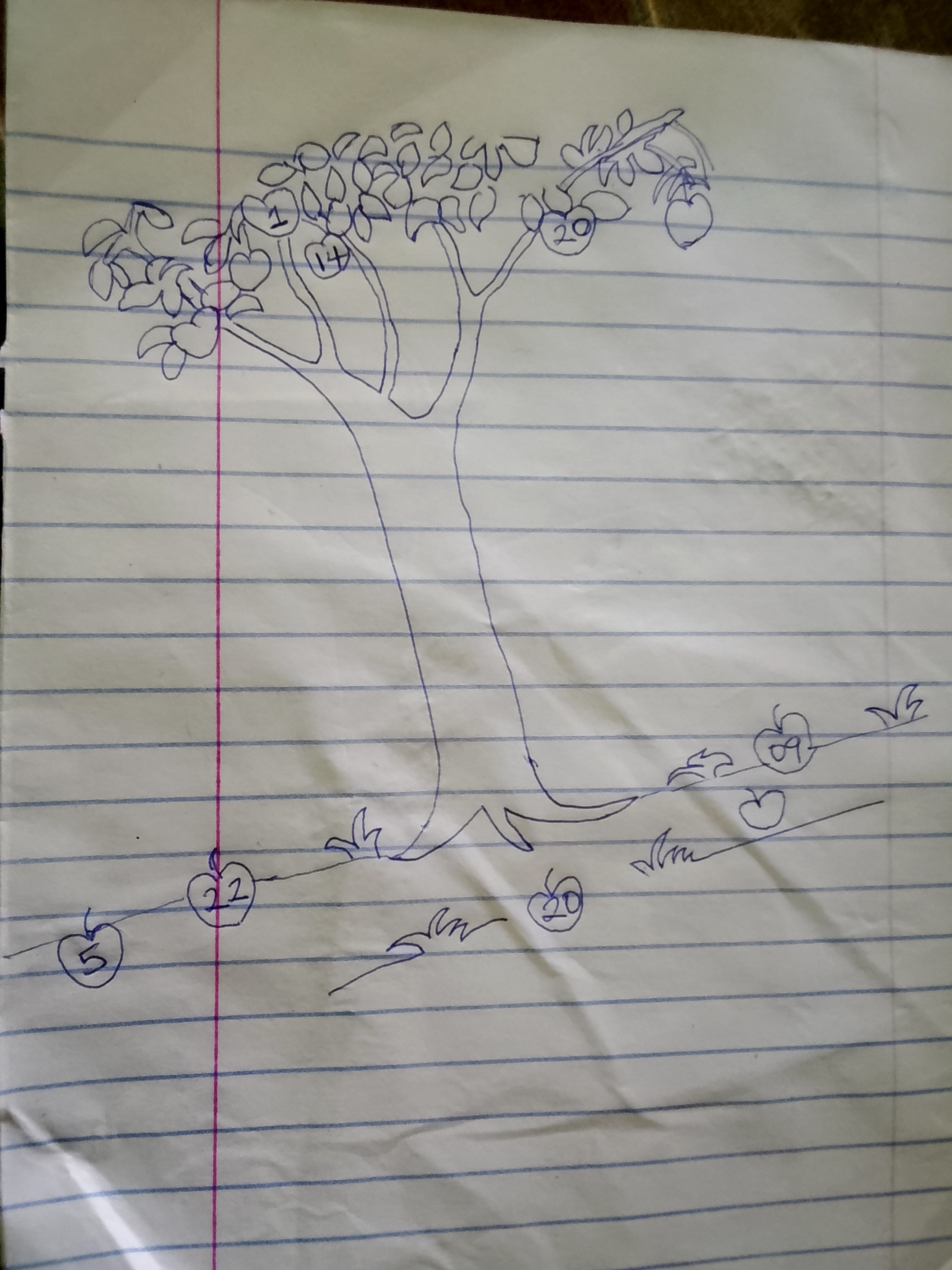 Drawing this tree was fun because I started with just one line and it became a whole tree full of apples and numbers. Every apple holds one of my lucky numbers. The ones still on the tree are waiting. The ones on the ground have already landed.