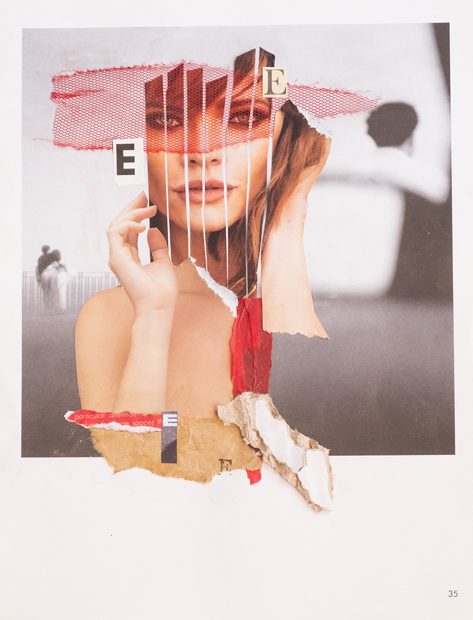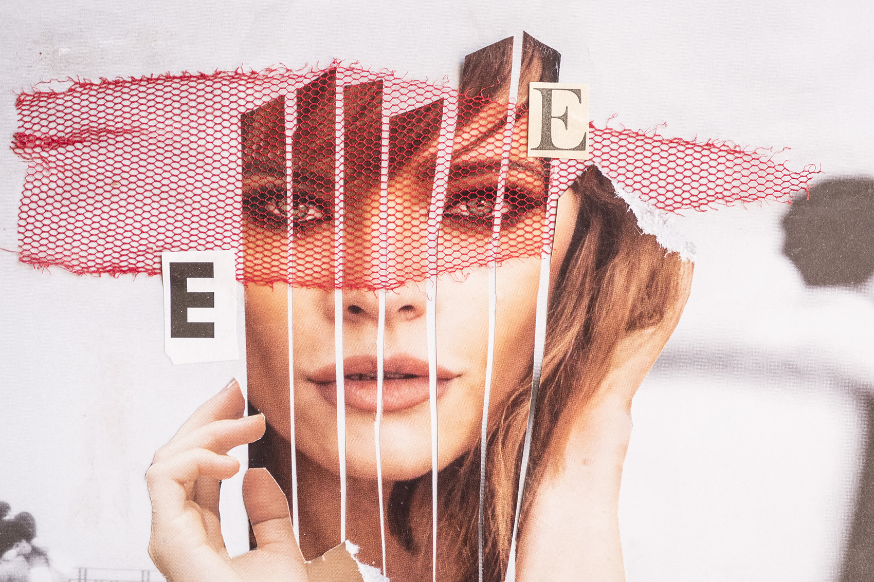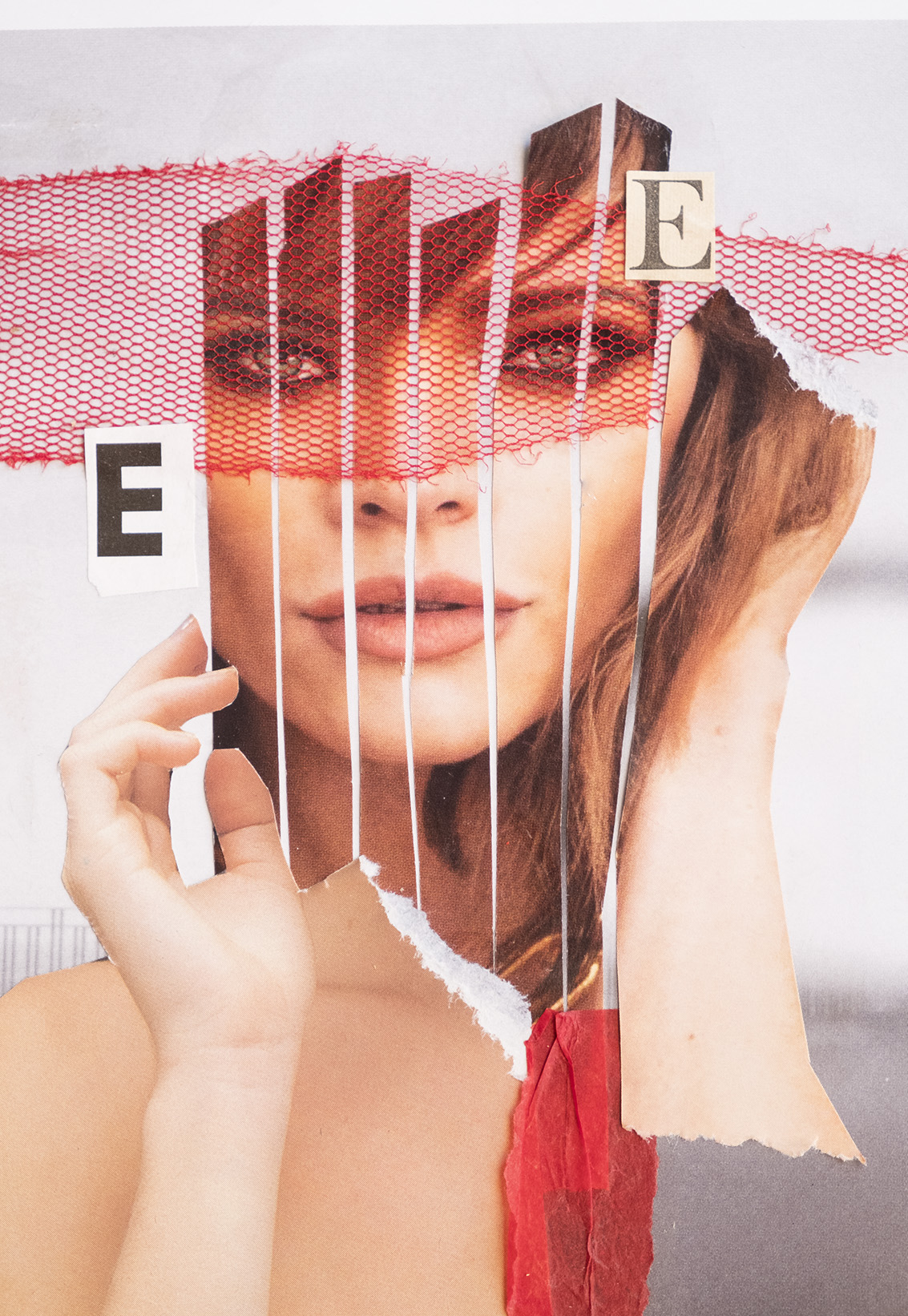I love this collage, the model's eyes are of femme fatale and this red net makes her mysterious
