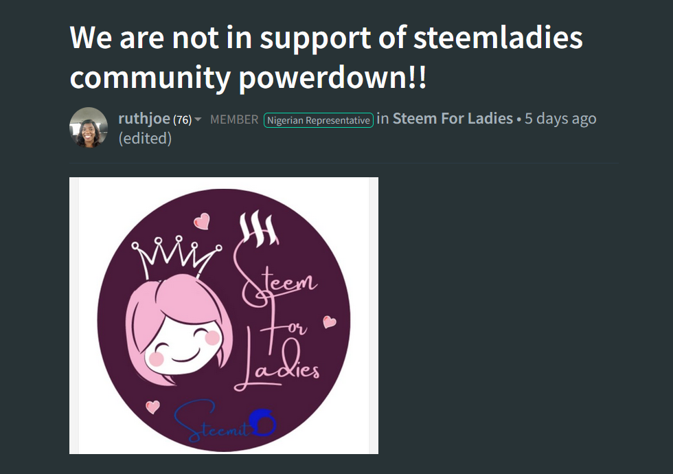 - Steem for Ladies or @steemladies, it was very active community and was grown quickly, had interesting contest and was supporting many, many users including myself and the users were setting up 10% of hteir reward to the community account @steemladies. The admin @liasteem is doing Power Down of the community account without saying anything to the rest of community moderators. The moderators now left community and created a new community