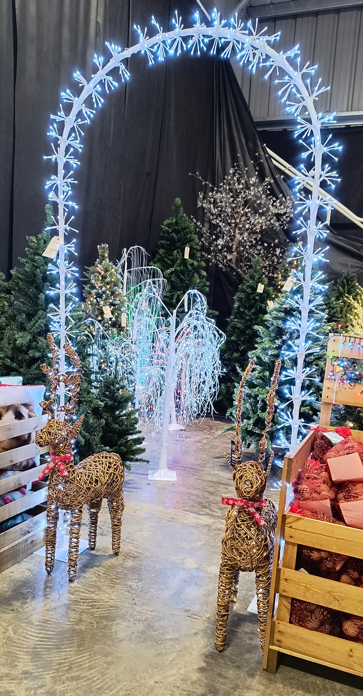 Here is another picture that I wanted to share. It was made in the garden center, what I love in this image that there is another symbol of Christmas those reindeer in front of the gate that is decorated with light bulbs. Reindeer themselves are made of the metal basic frame and wrapped with such brown coloured wire and they are very well done!