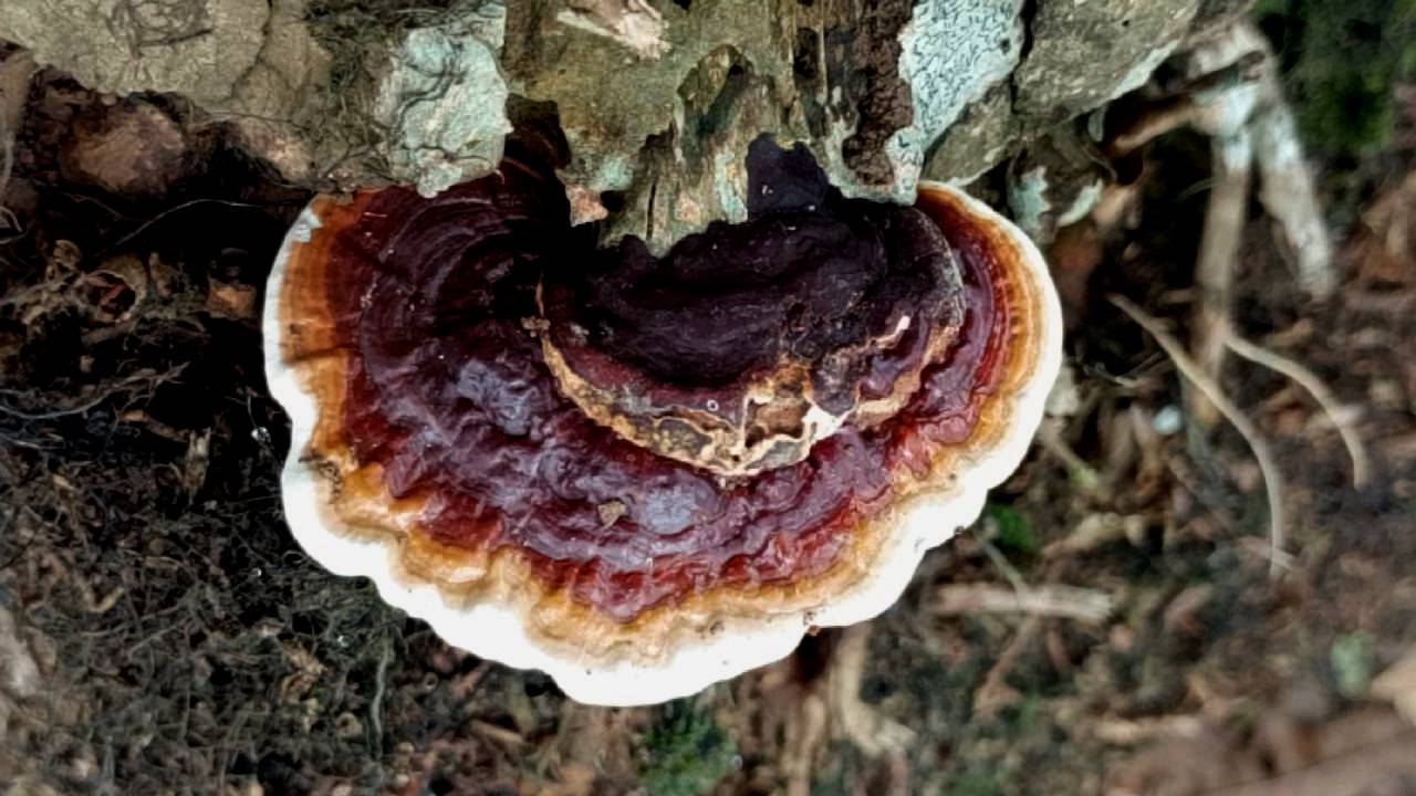 Tonight, I'll show you another type of mushroom I've named Kelana Flower Mushroom. I found this mushroom growing on a cut areca nut tree trunk. It's truly beautiful to look at. It also has a unique and beautiful lip at the tip, or edge, with a wavy curve and a white, orange, and light brown coating.