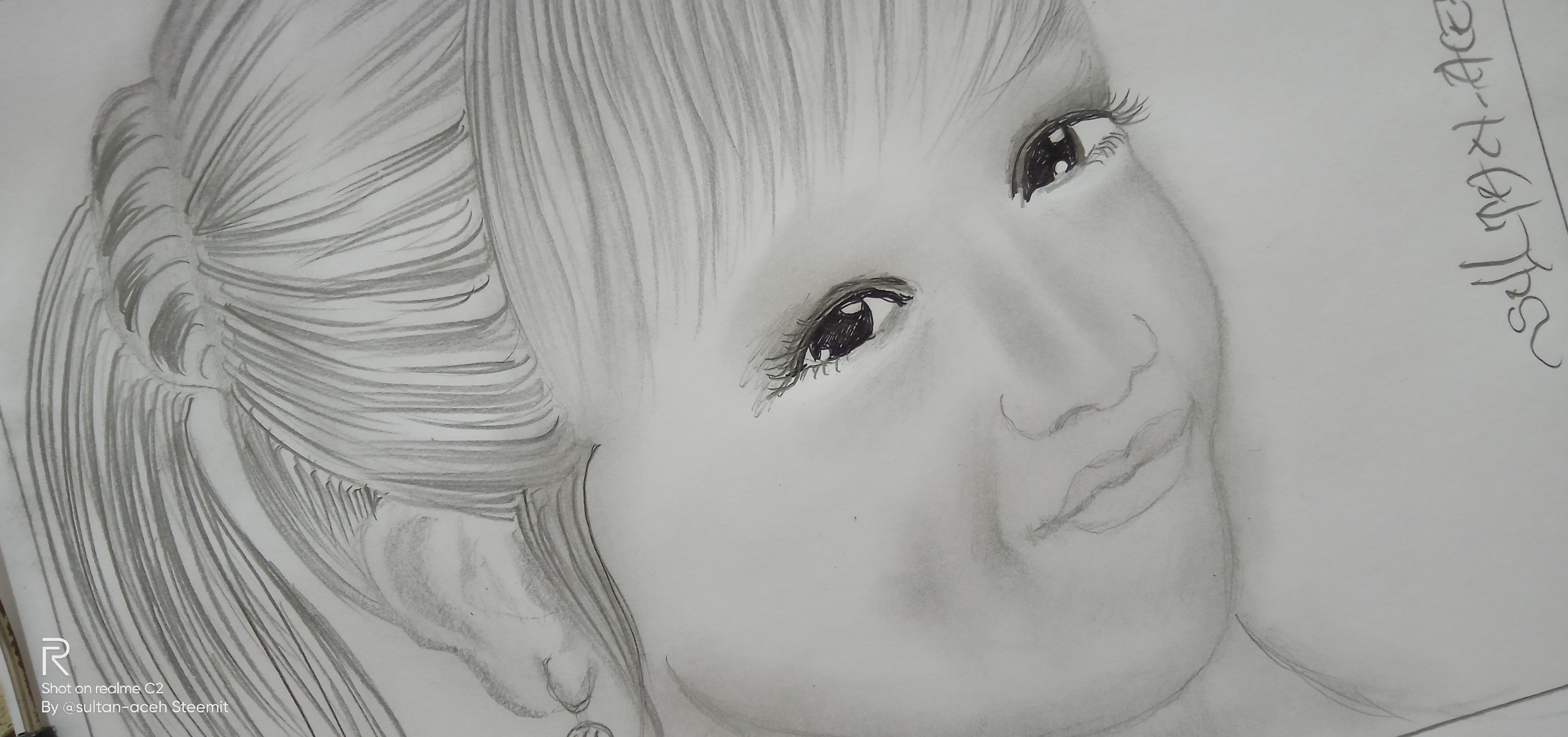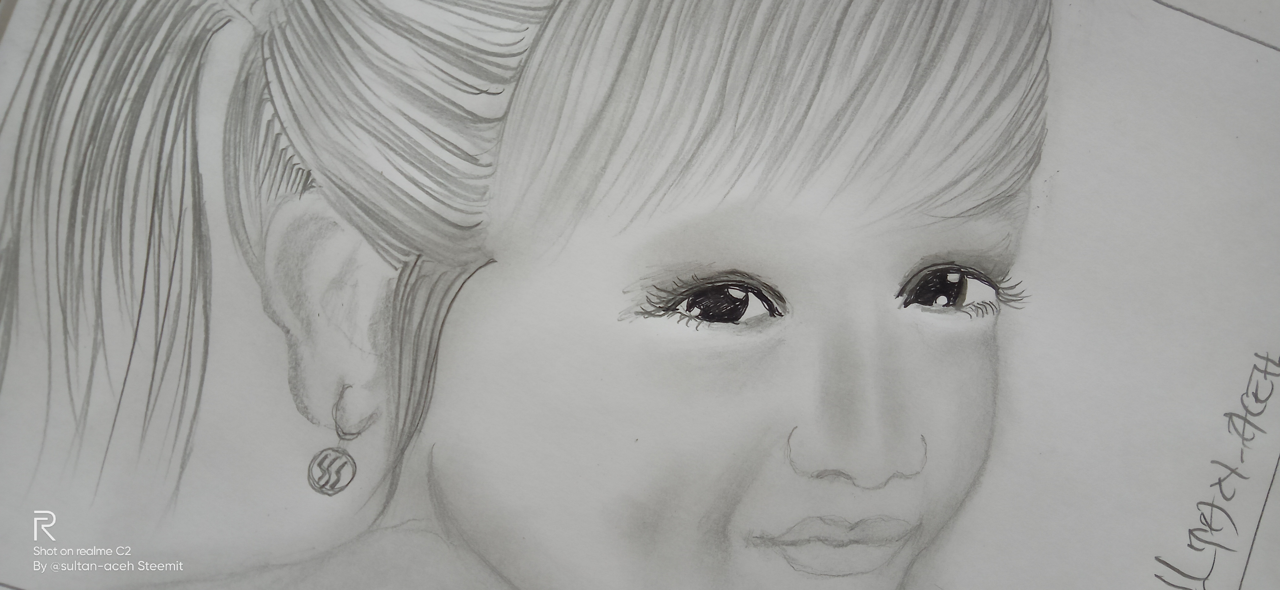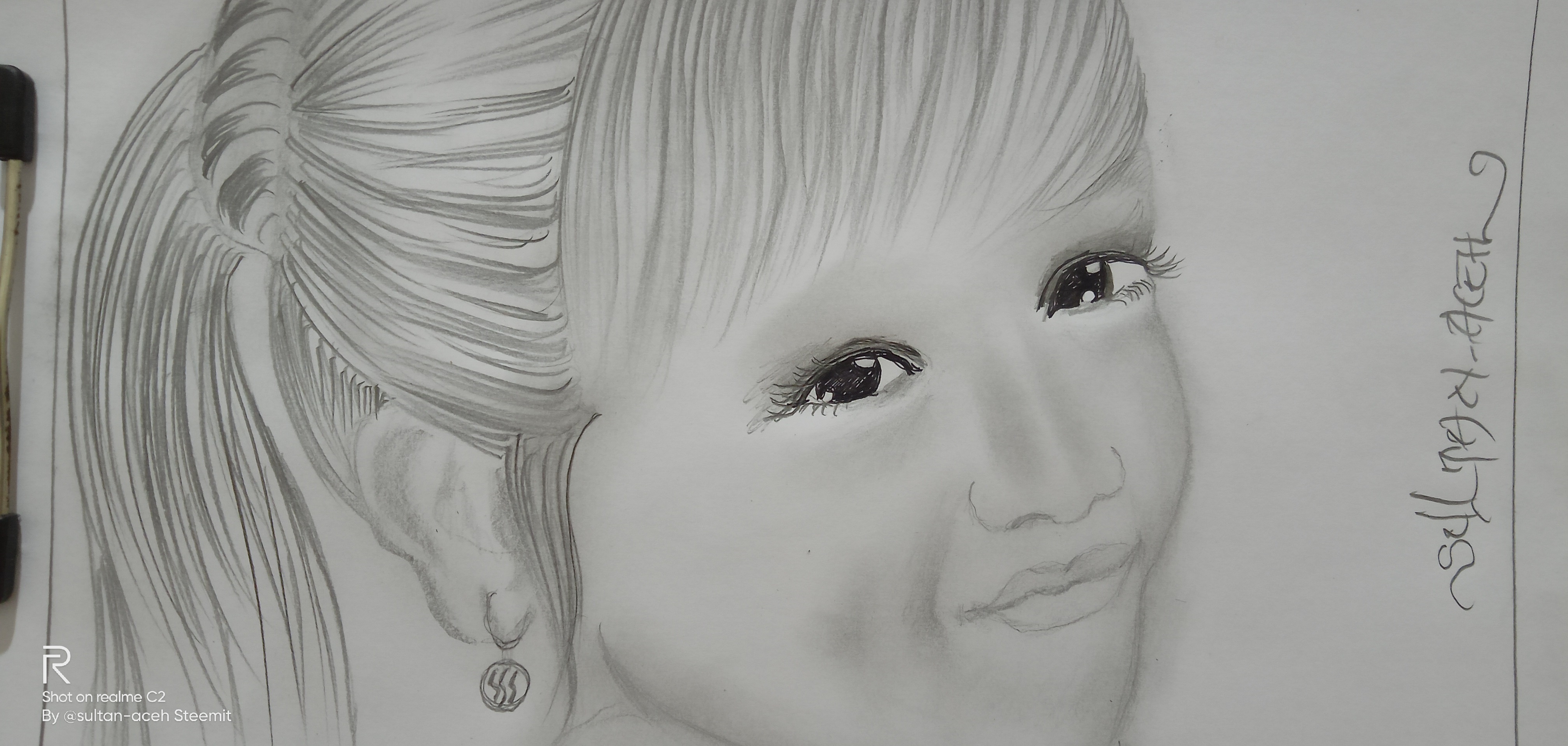 in the picture you can see, in the hair section I made it with fine and rough strokes, with small hair knots behind it. on the face, I made this girl's smile even more subtle using a tissue, and on the eyes, I added black ink to color it.