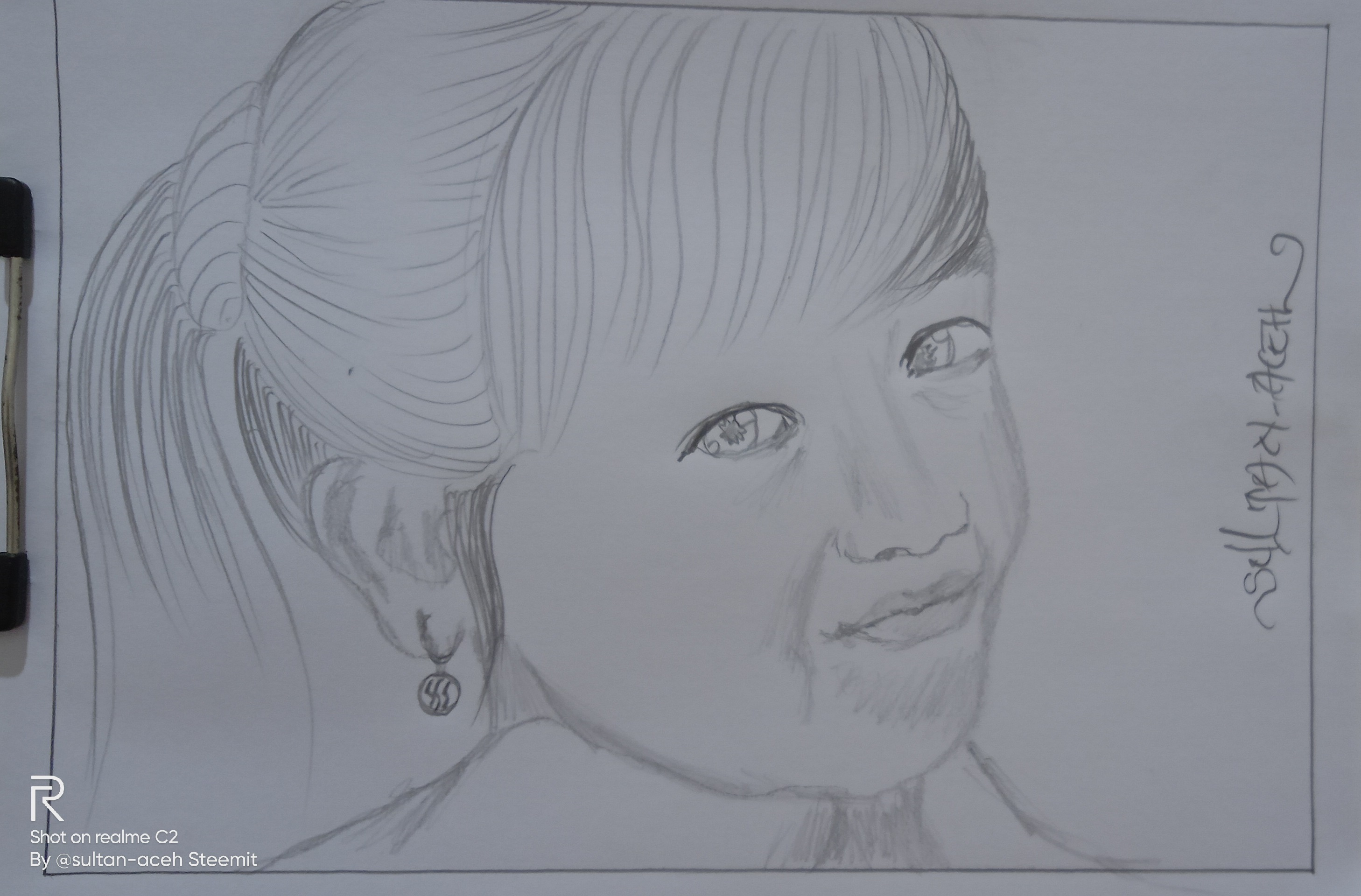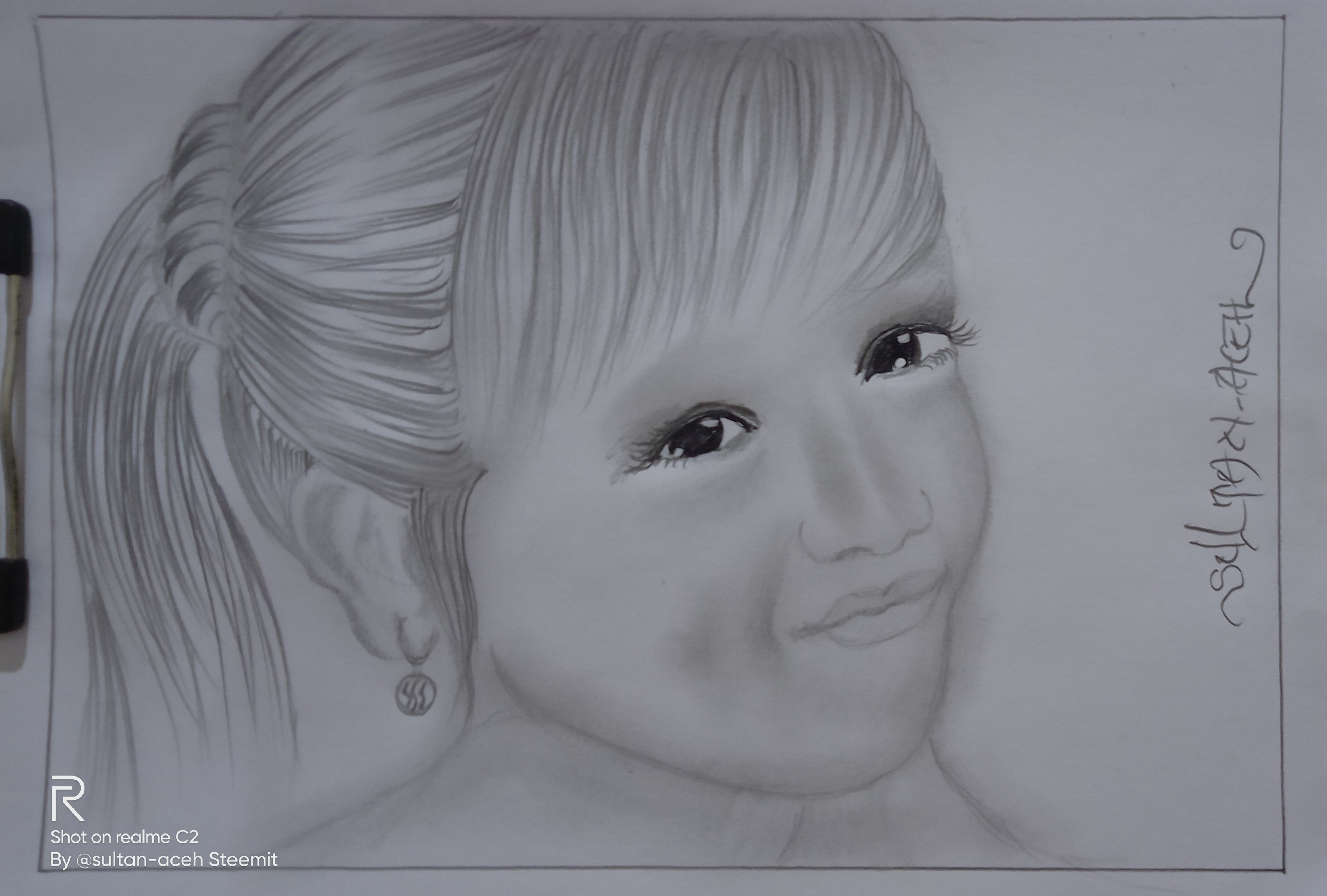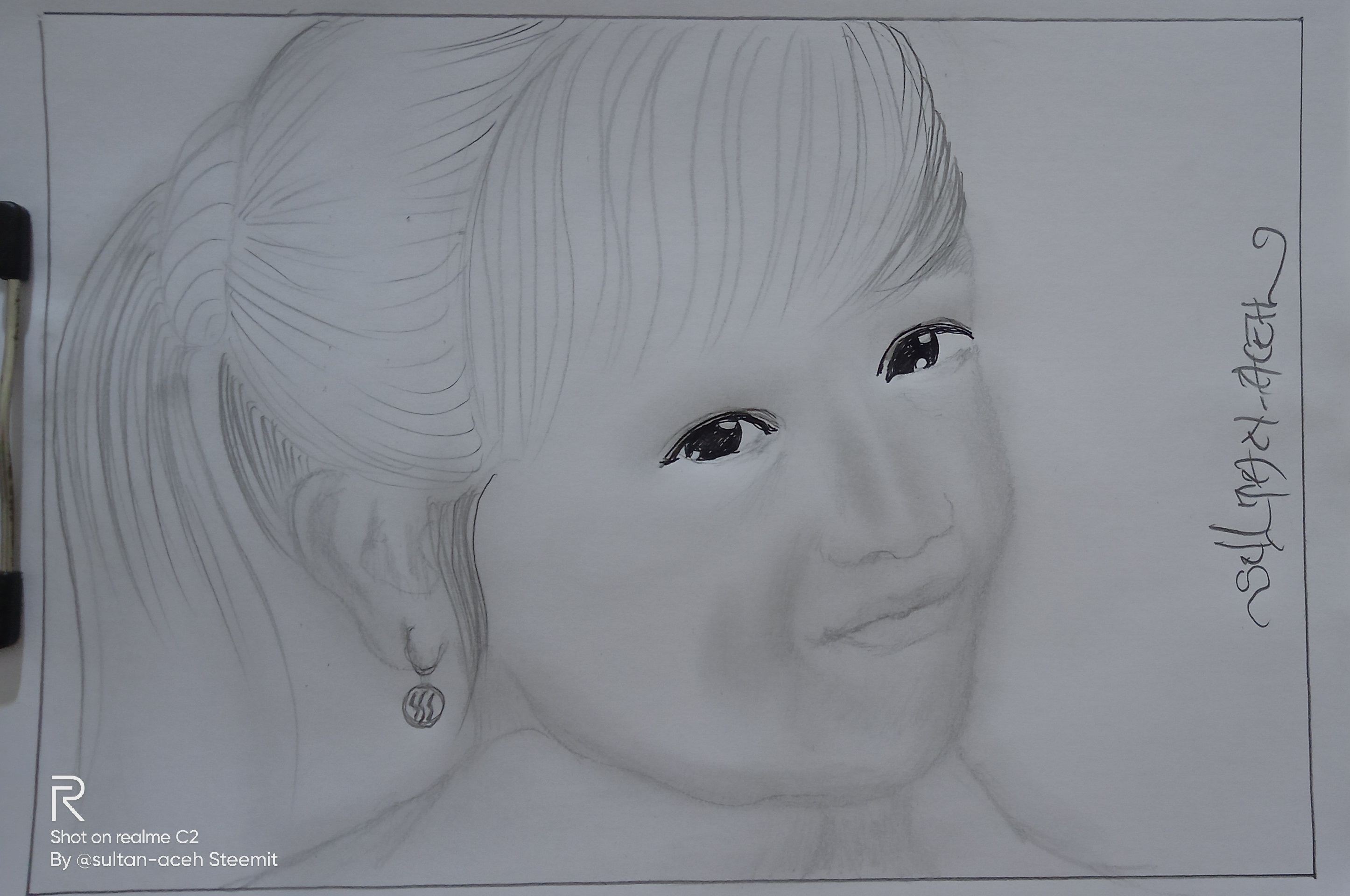 in the picture you can see, in the hair section I made it with fine and rough strokes, with small hair knots behind it. on the face, I made this girl's smile even more subtle using a tissue, and on the eyes, I added black ink to color it.