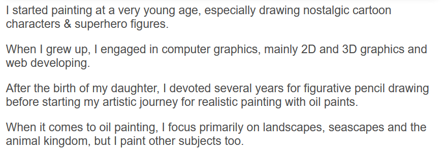 @ranartblog or Ran, he is a painter and an art Instructor from Tel Aviv, Israel, he recently joined Steemit platform and became very active member of WOX. He has an Art blog that contains many tutorials and his works, this little snapshot about him from the website:
