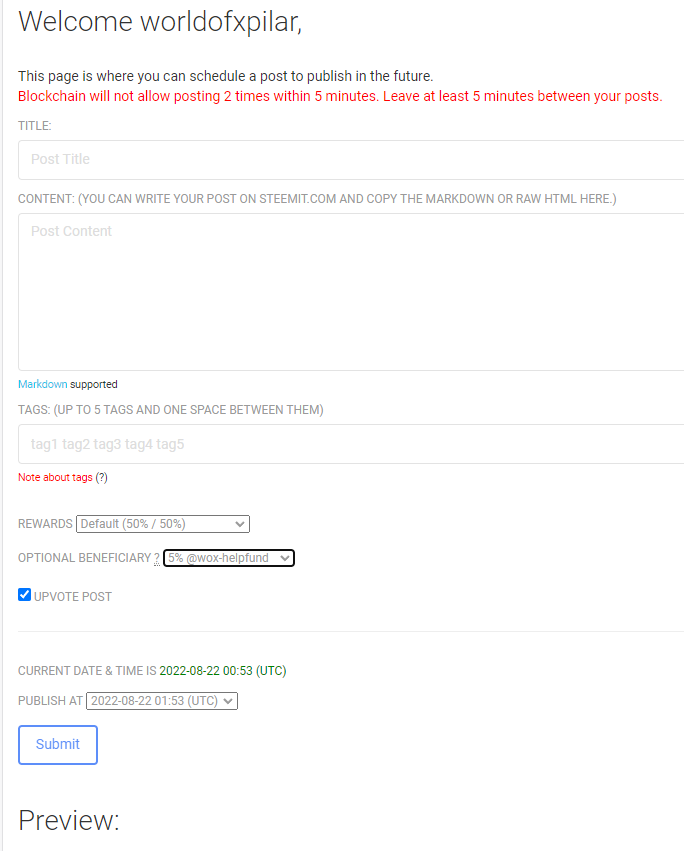 Scheduled post can be used to write now and publish on steemit on a later date/time (when the user wants to get it published ) . and it also has an option to sent benificary rewards to @wox-helpfund (only if the user want to make donation to charity )