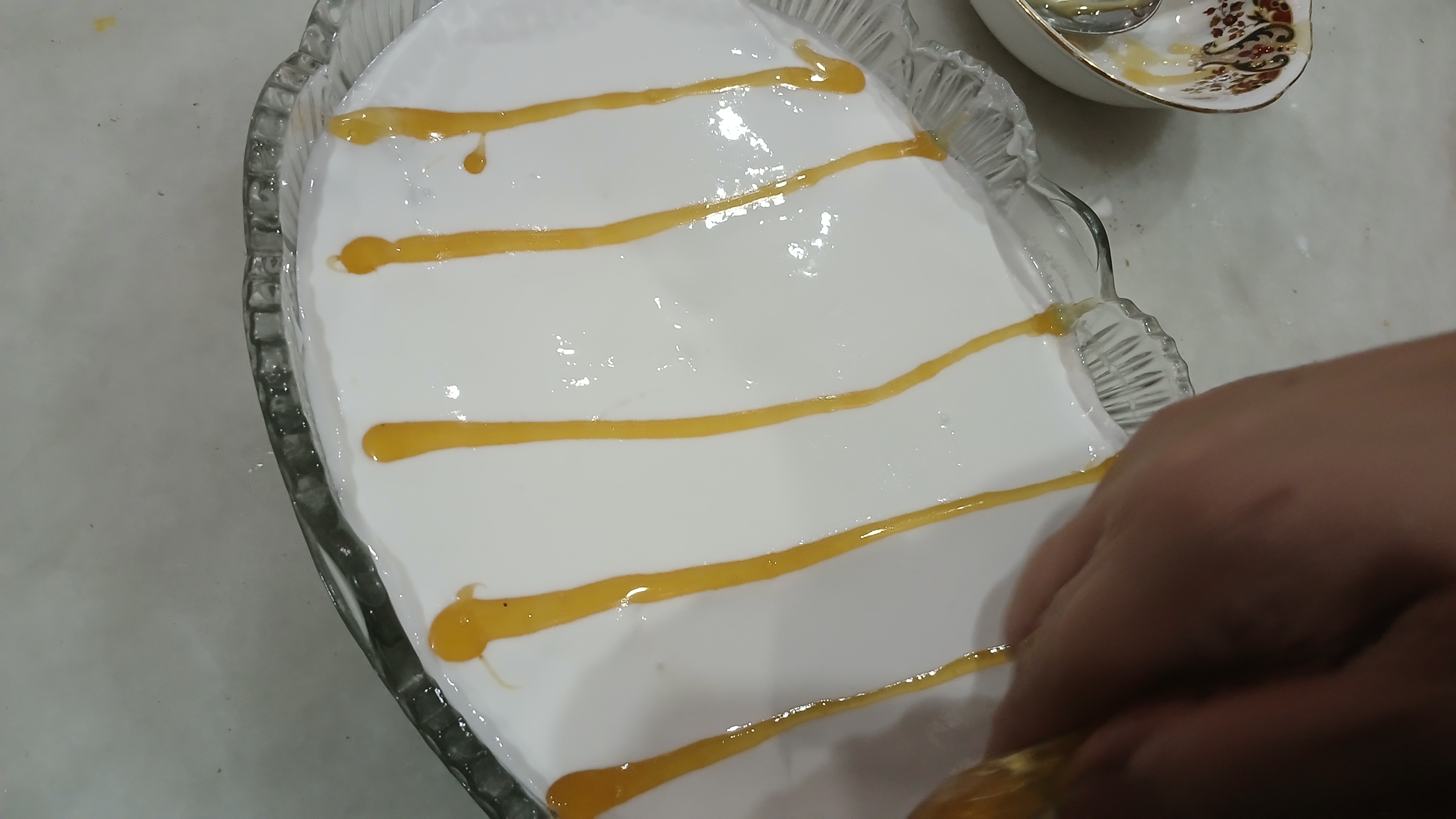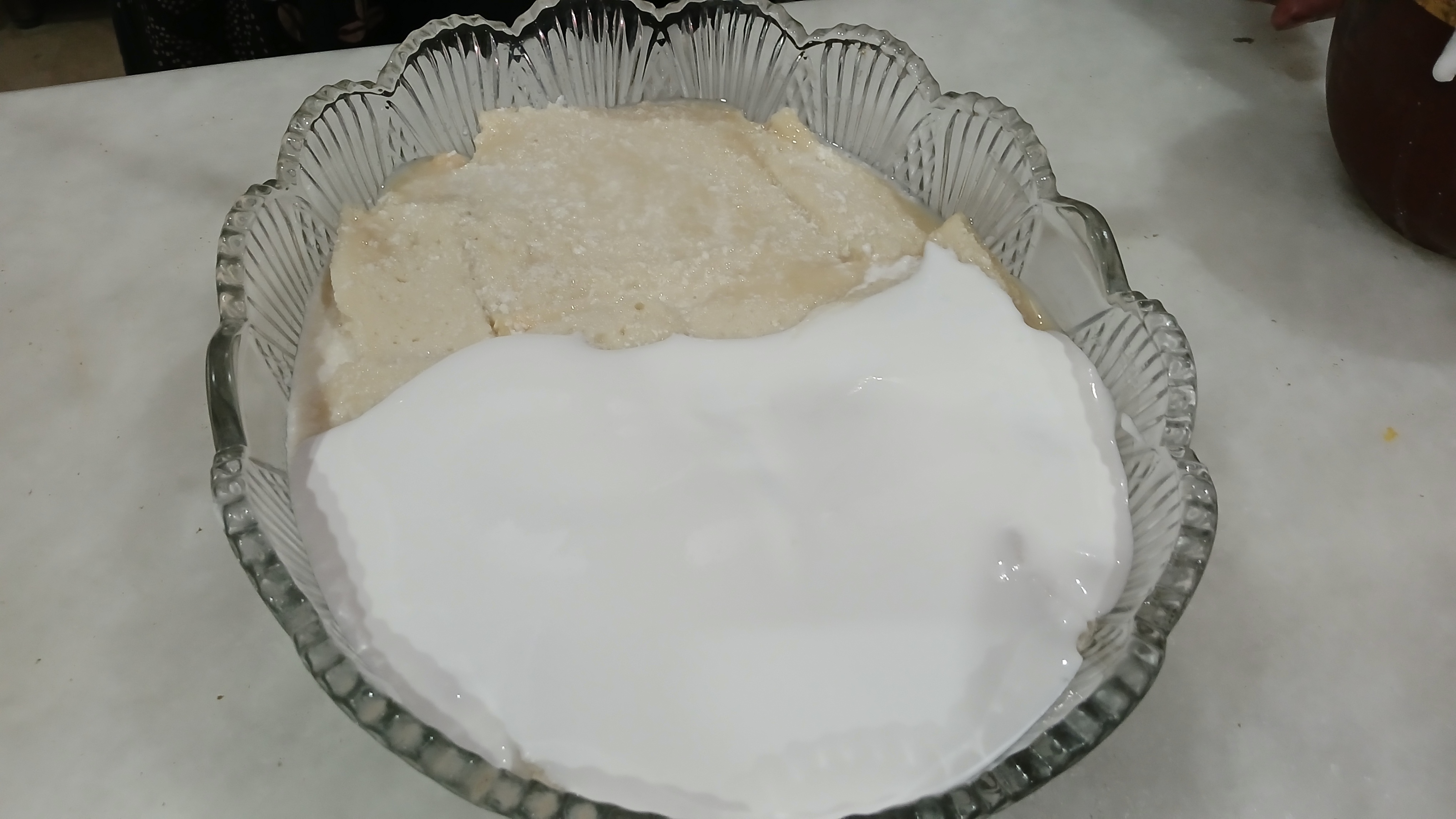 - Pour some milk mixture at the base of bowl in which you're going to present your dessert. Add bread slices all over the base and pour some more milk mixture make another bread layer and soaked it with milk mixture.