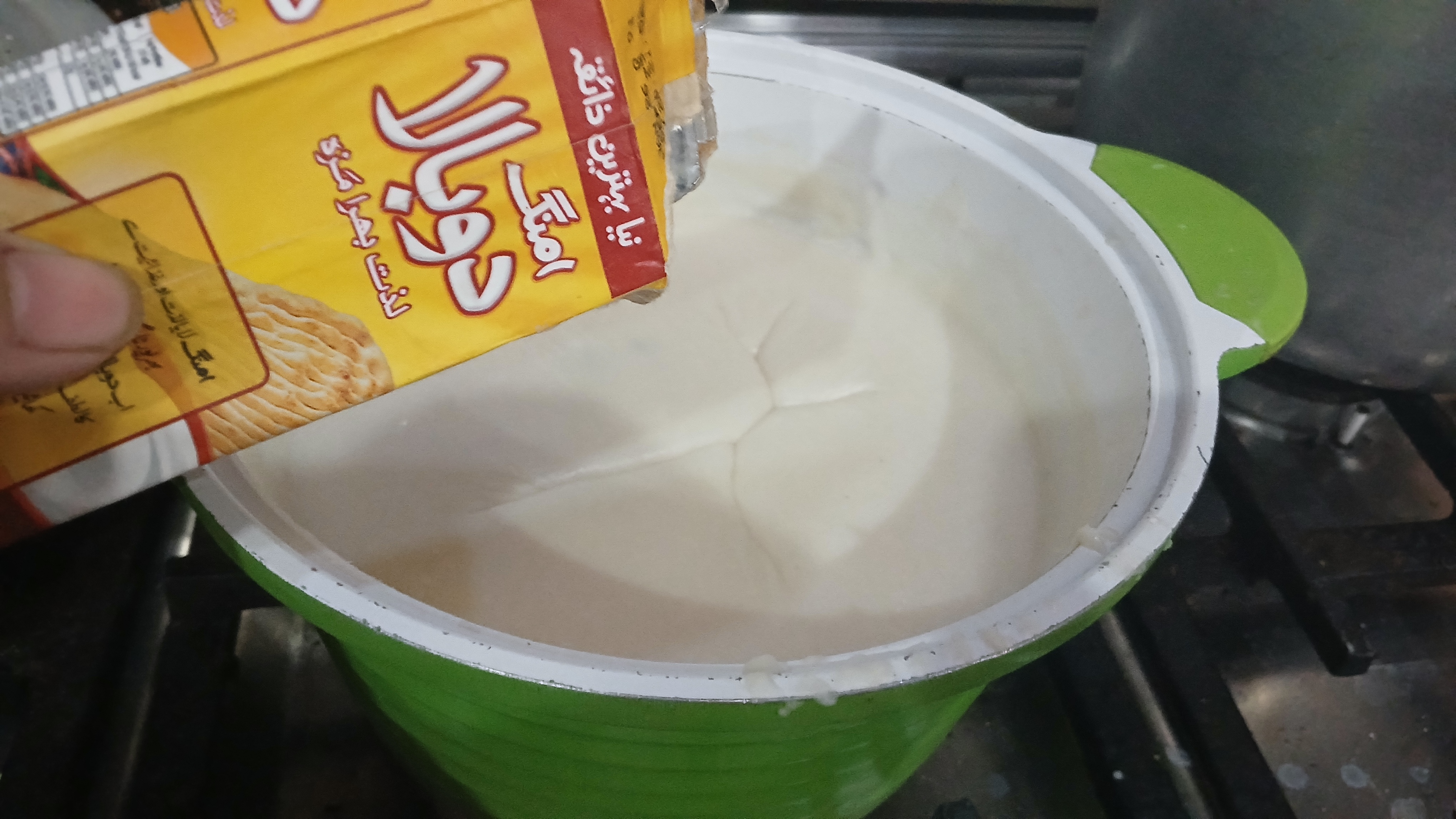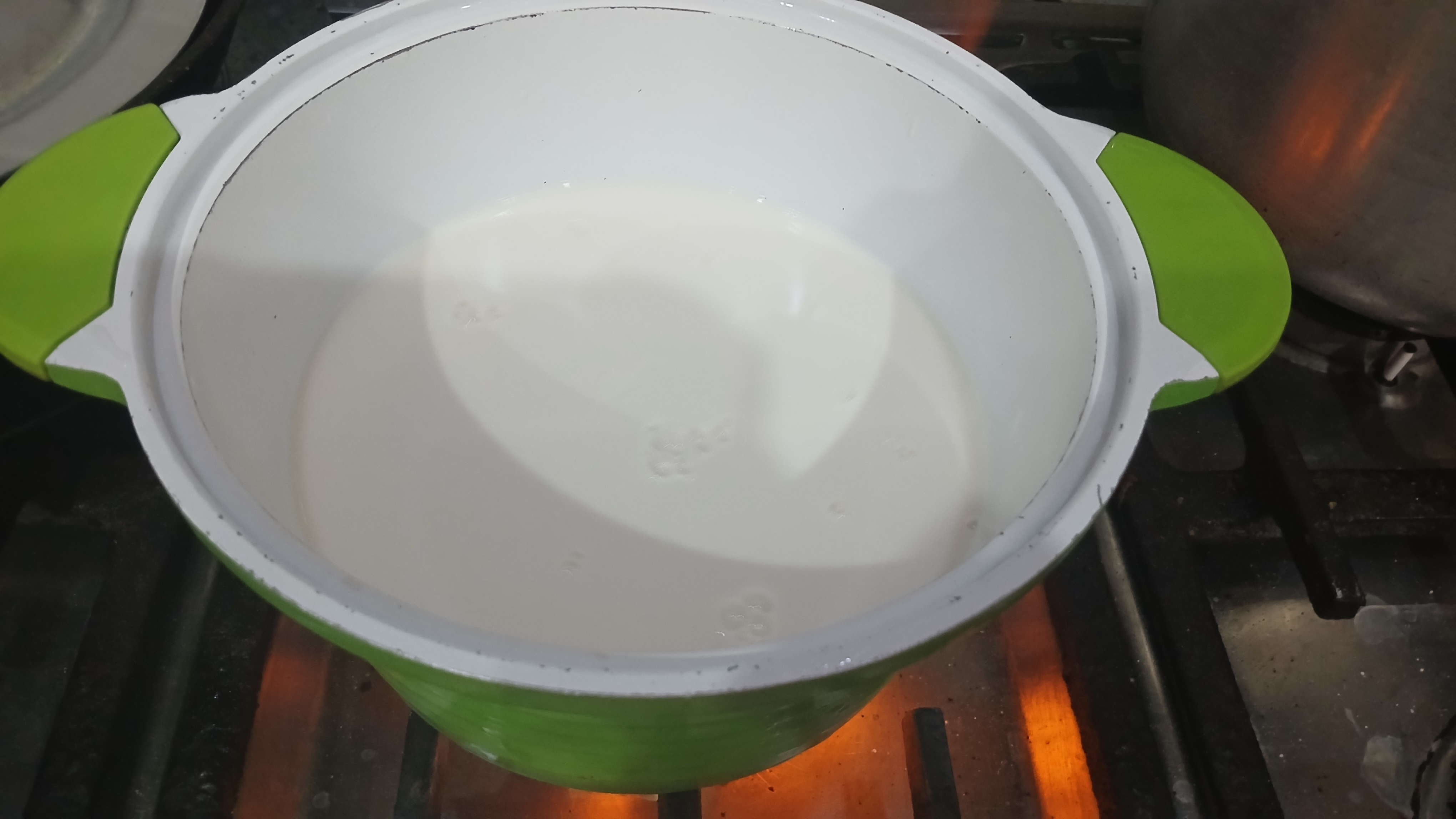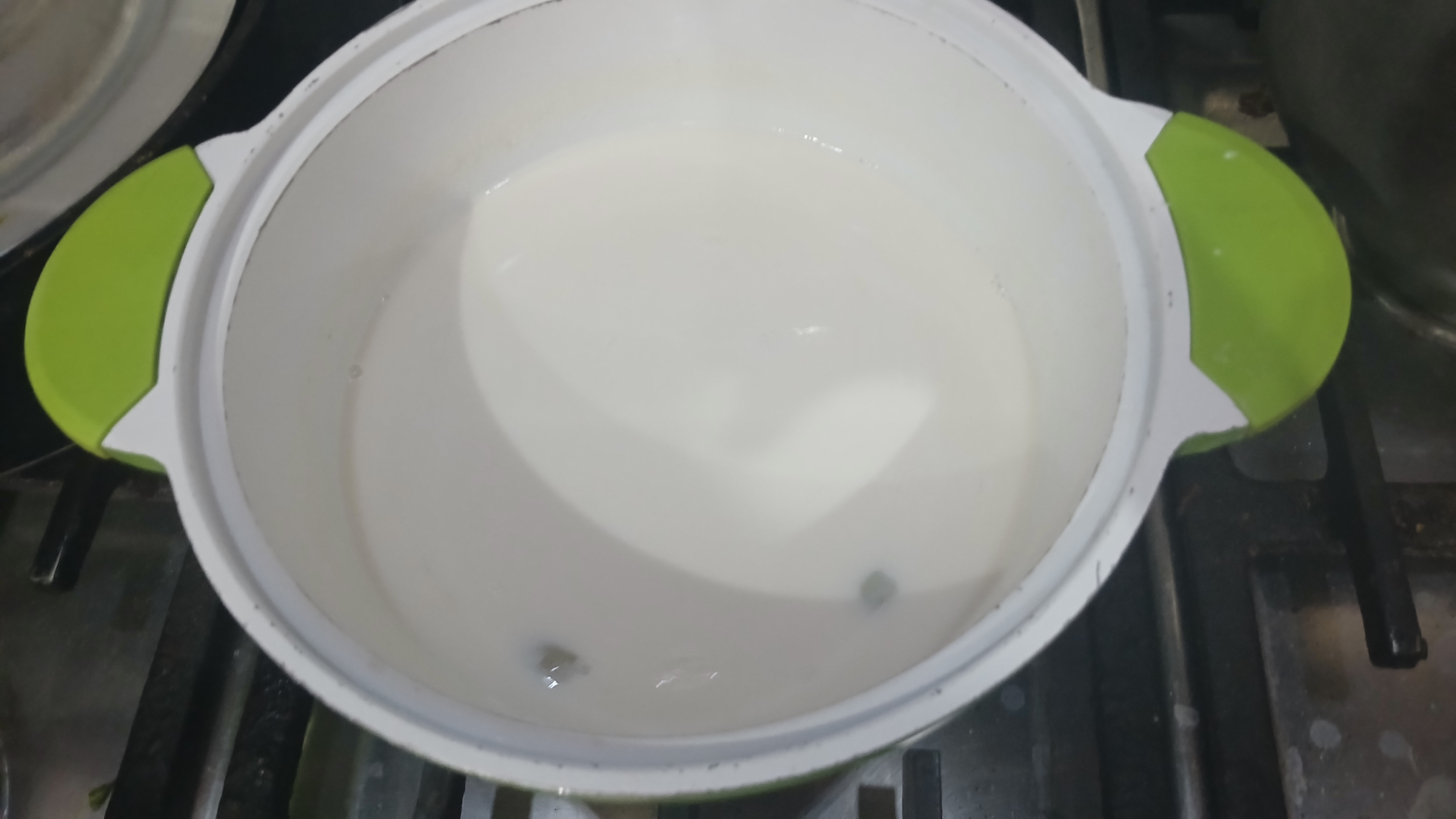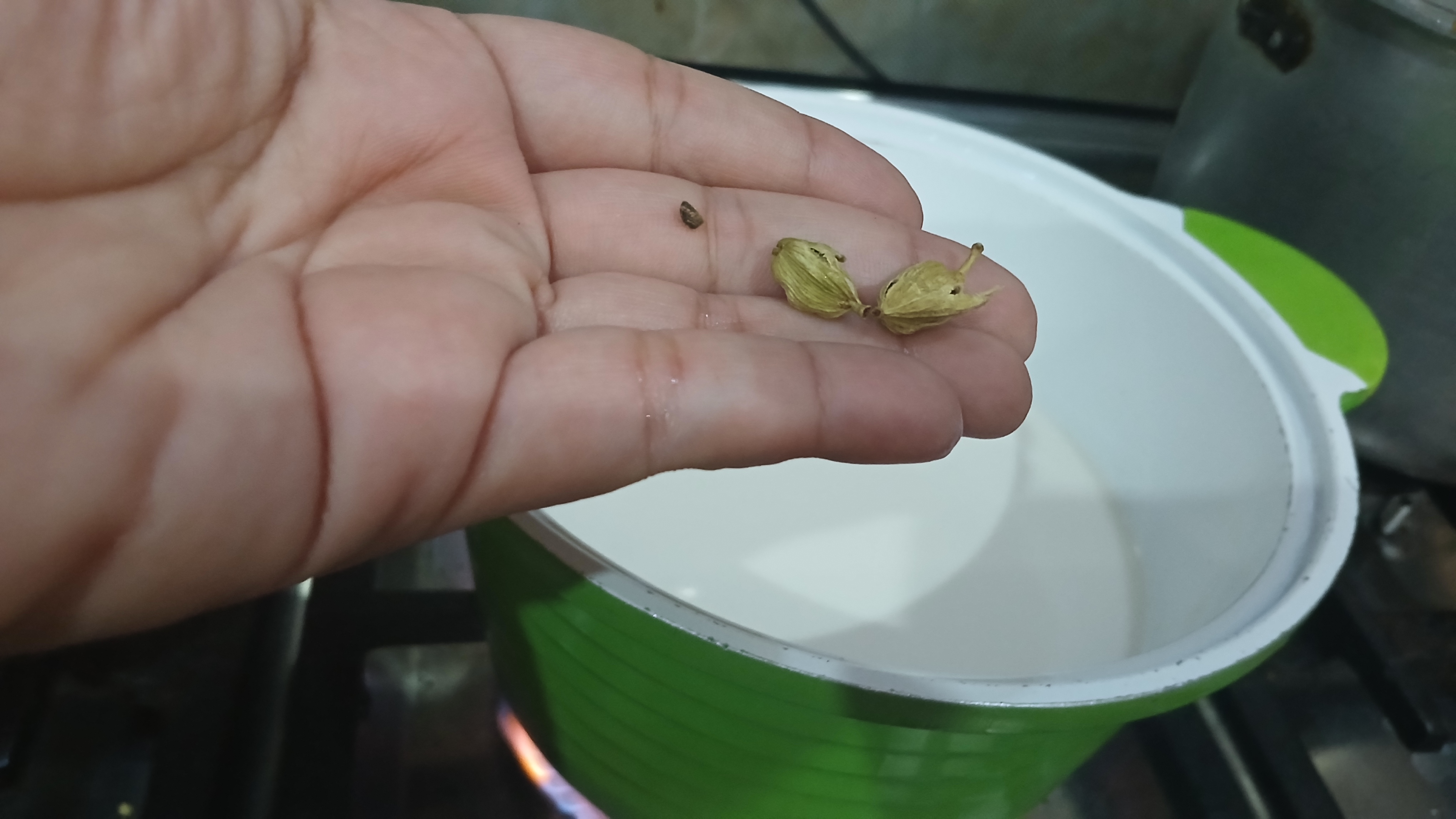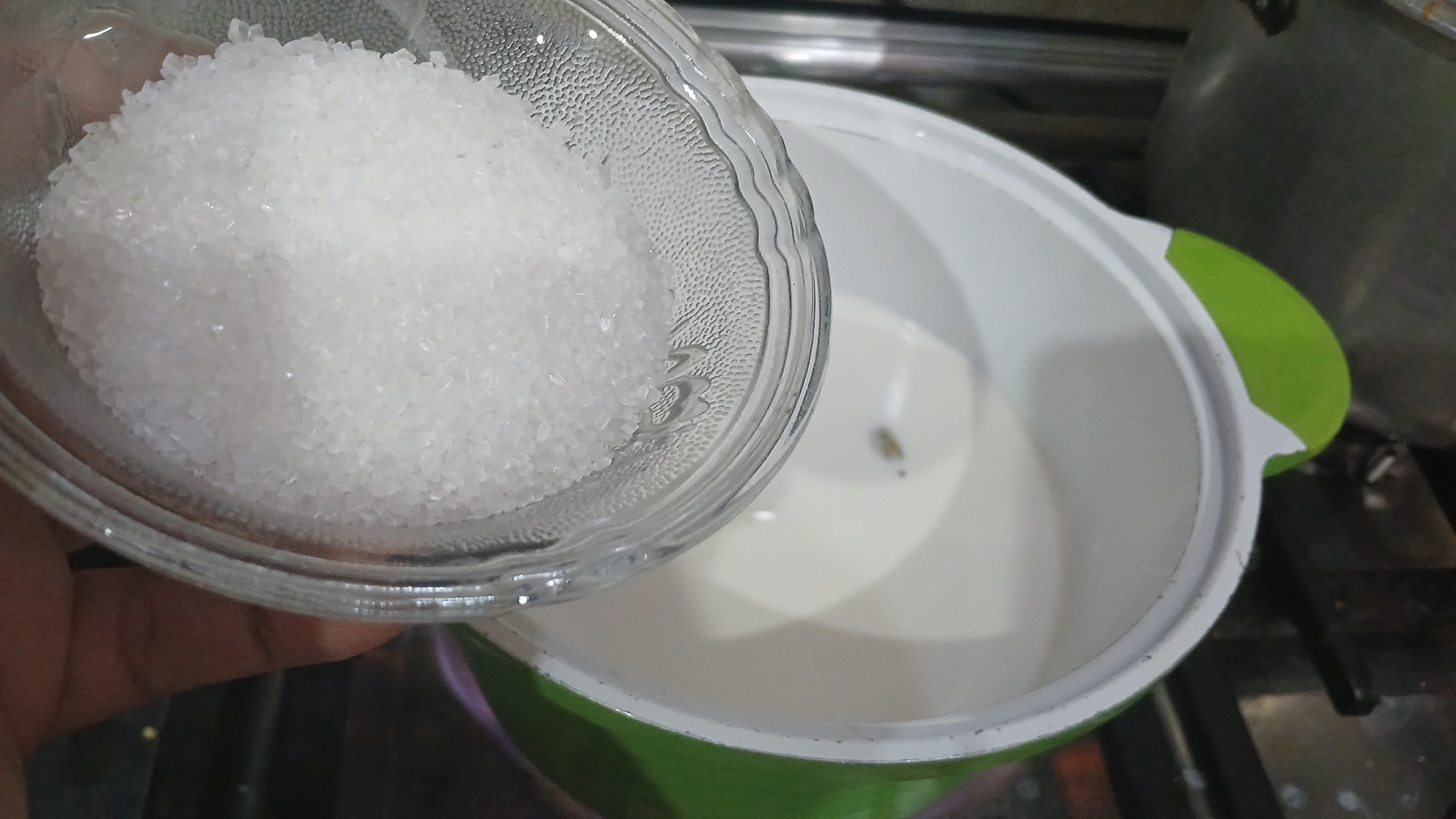 - Take milk in a clean pan put it on stove and boil it. Add 2 cardamom in it and cook it. Add dugar in it and cook it on low medium flame.