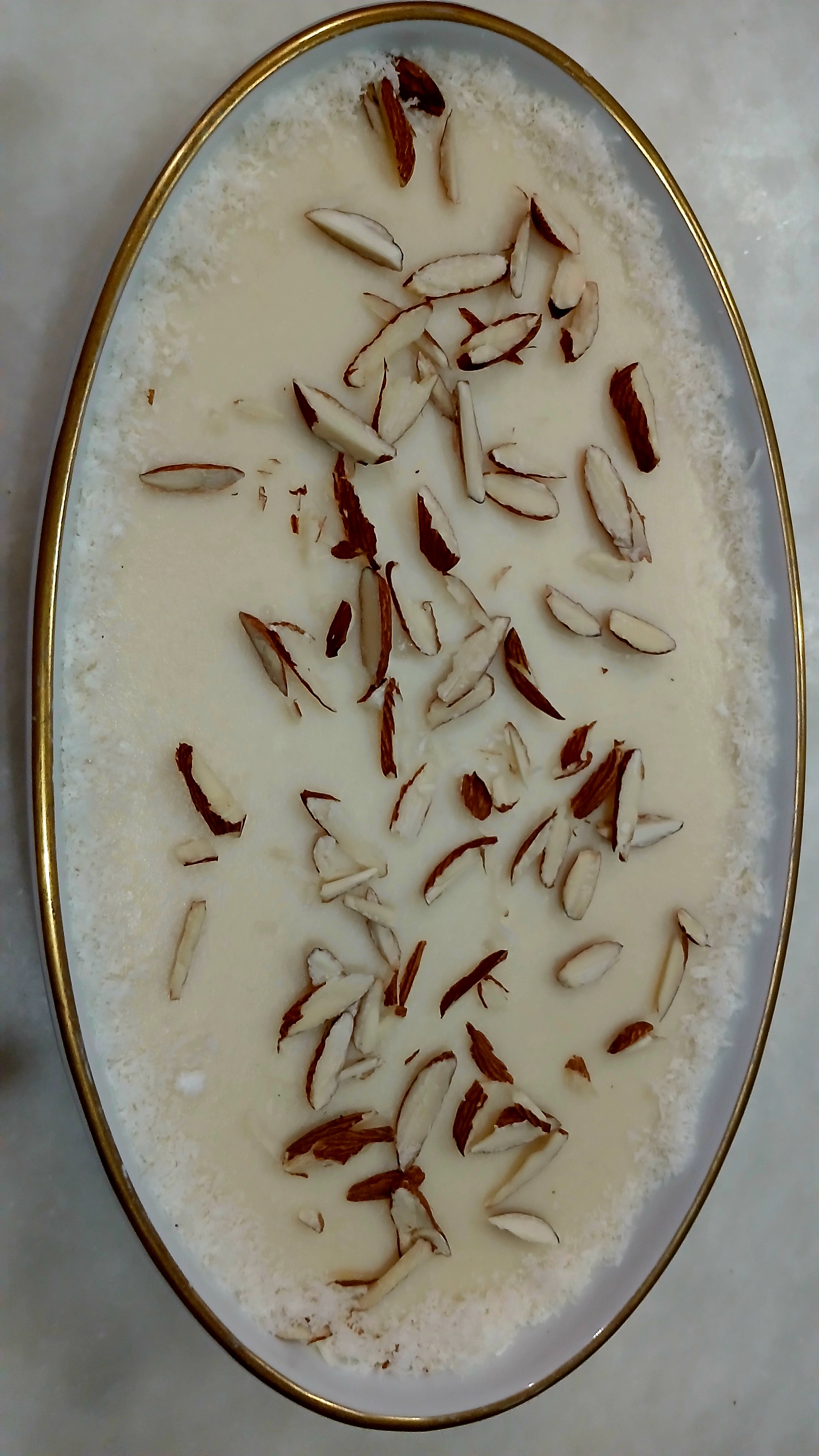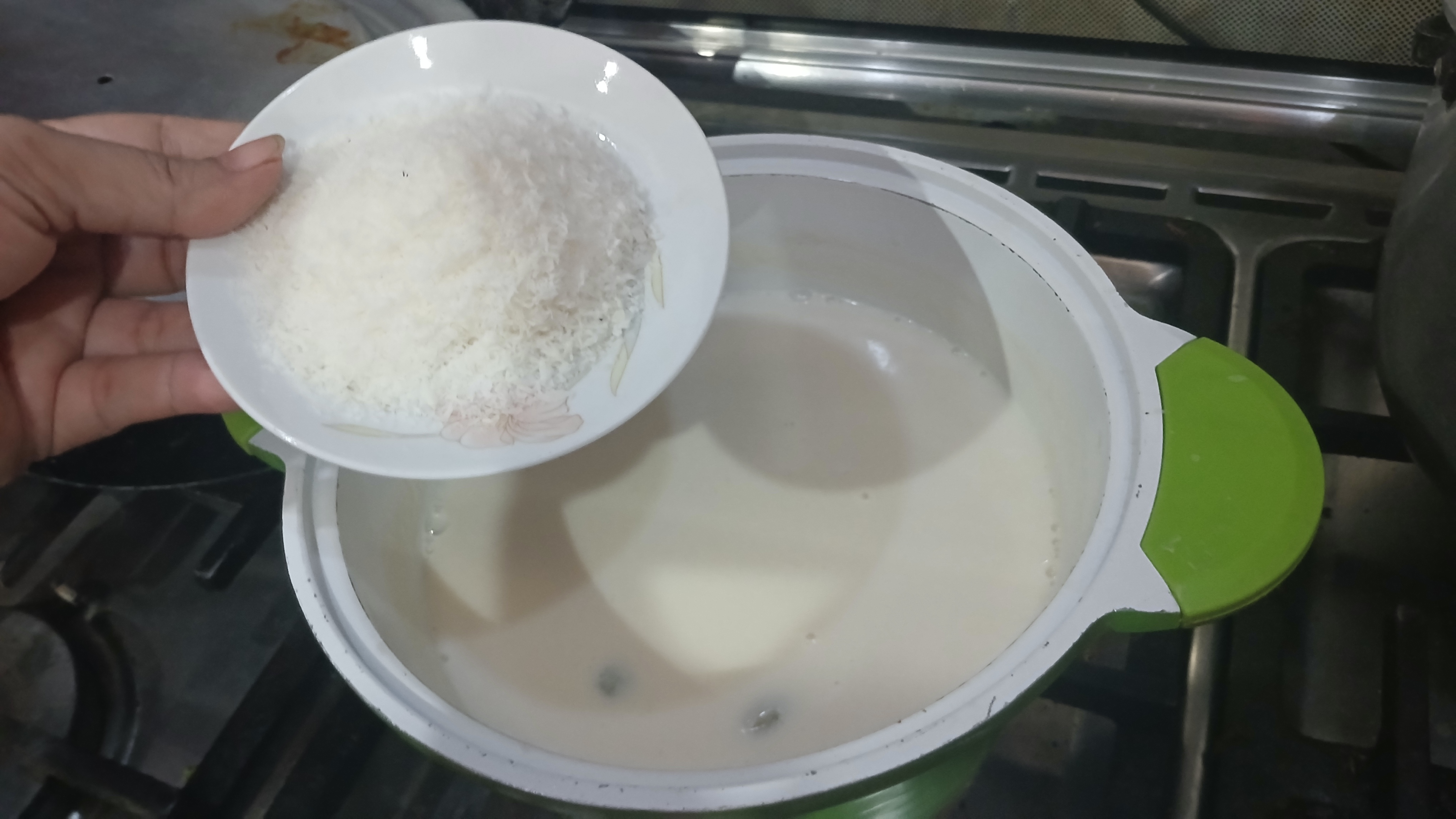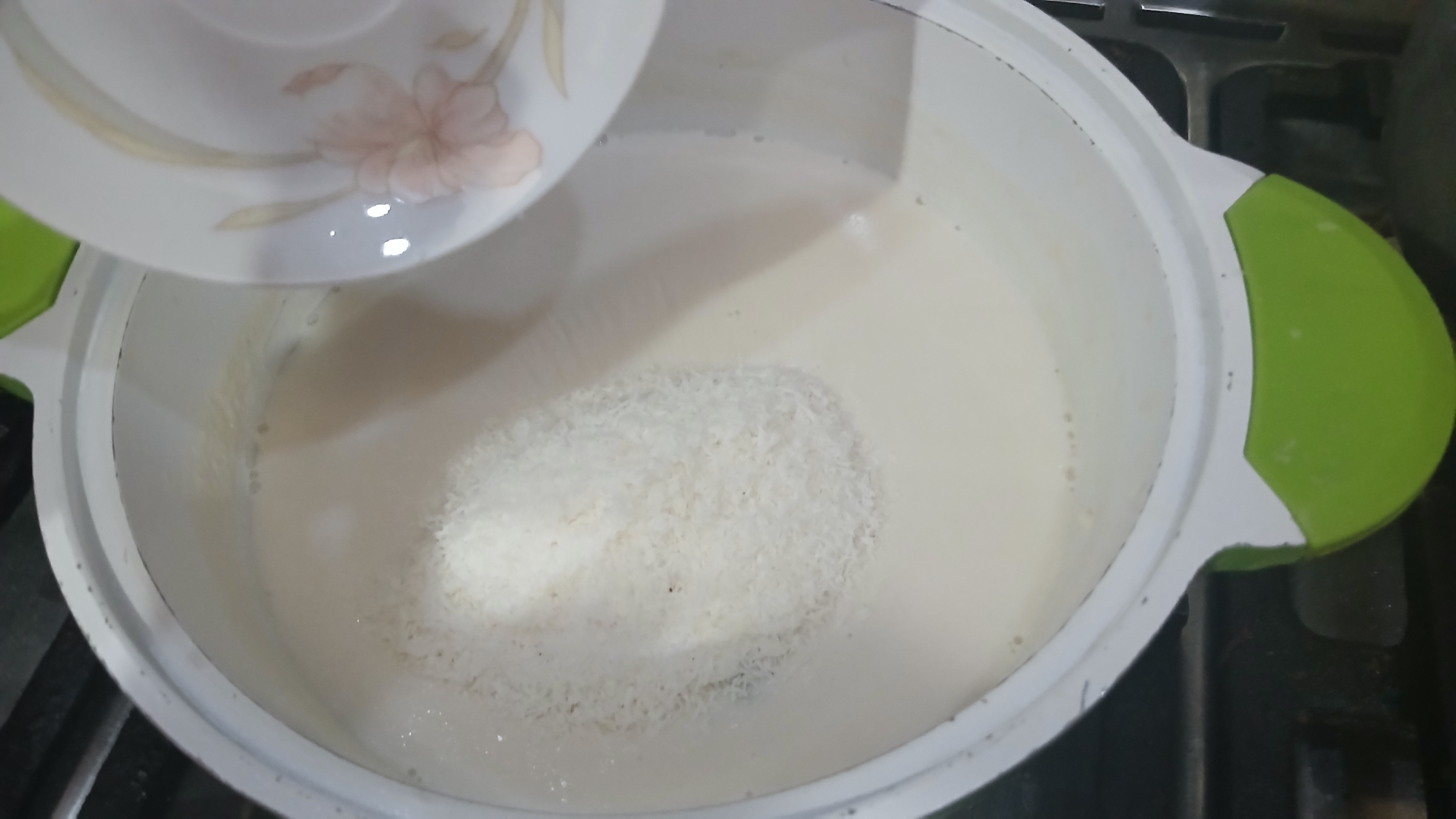 - Add desiccated coconut in pan and cook it for few minutes more.