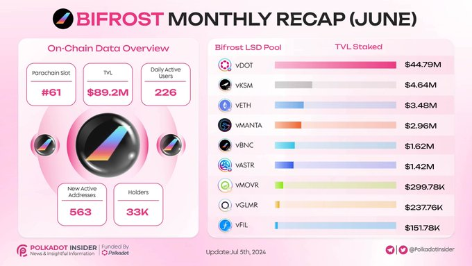 1\5、#Bifrost 6 月份成绩单出炉了readonlm (56)in wormhole3 • 2 years ago 1\5、#Bifrost 6 月份成绩单出炉了,表现依然强劲啊!第 61 个 Parachain 槽位,这说明咱们在 Polkadot 生态圈里已经站稳脚跟了。89.2M 美刀的 TVL,证明了投资者对 Bifrost 依然信心十足。226 个日活跃用户,看似不多,但这可是稳定的核心用户群,质量比数量更重要!#mferc #Bifrost #Bifrost #mferc