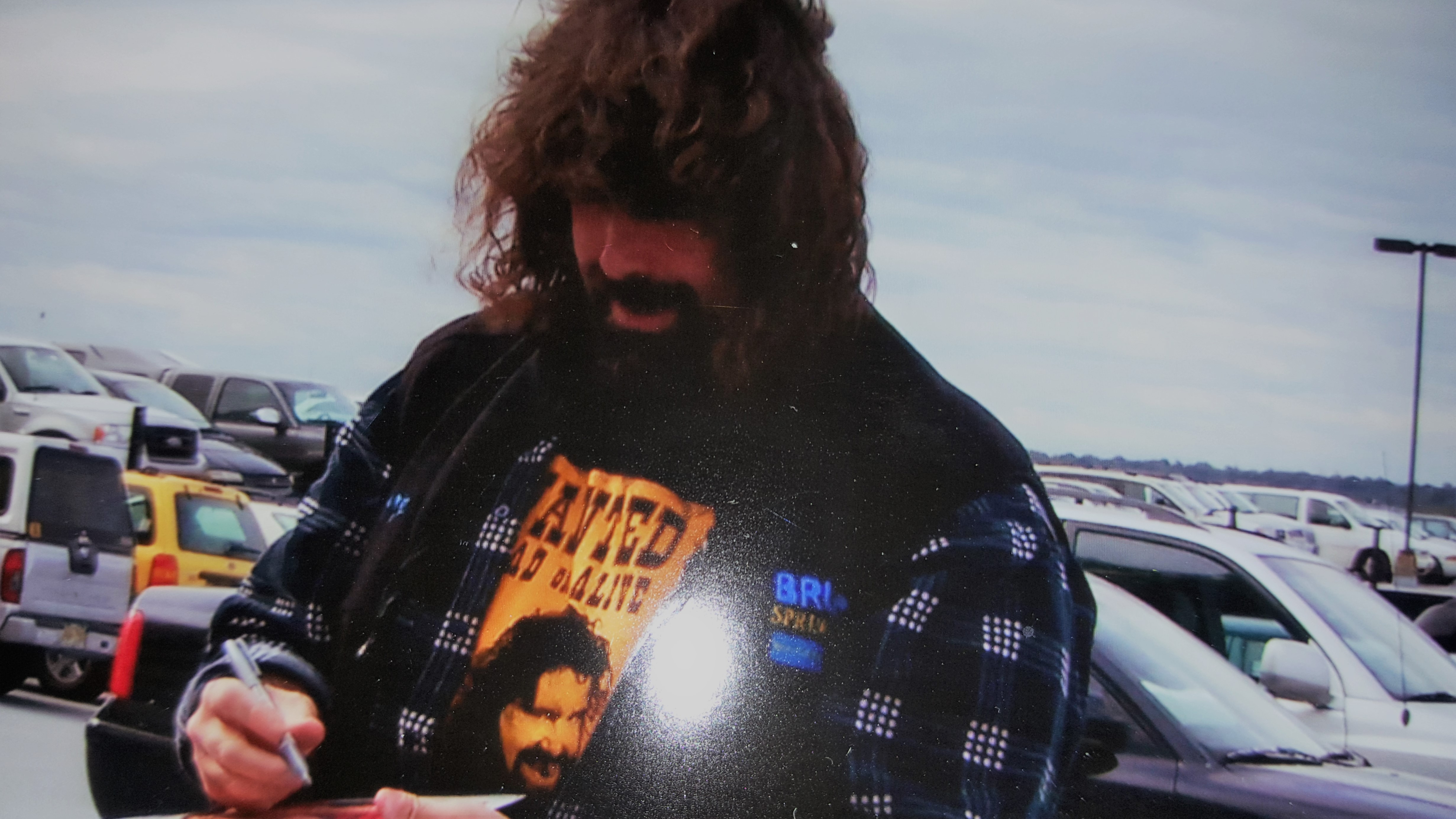 Anyway, I digress. No sooner did the guy next to me leave, but a van pulled in to that spot and the driver looked very familiar. After doing a double-take, I noticed that the lone person in the vehicle was Mick Foley. Arriving a little after the event started, it was no wonder that he seemed to be in a rush. As we both got out of our vehicles, I happened to mention to him that I loved his book. He genuinely thanked me and before he was on his way he asked me if I knew where the elevators were. To his disappointment, I explained that there weren't any working elevators that day. Upon hearing this, he slid up the handle to his suitcase and started on his way down the very long car ramp.