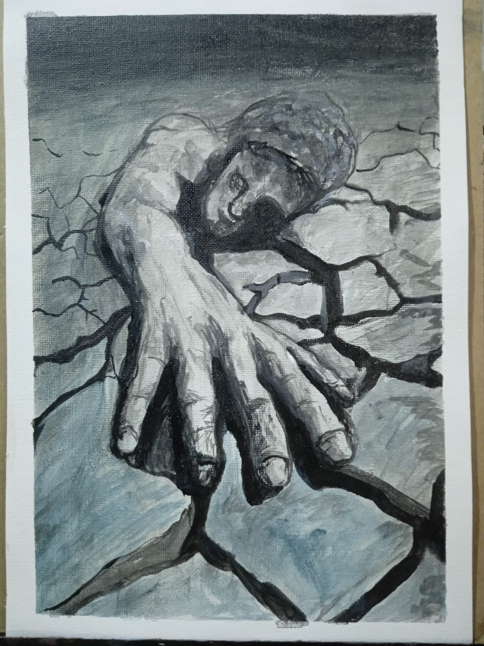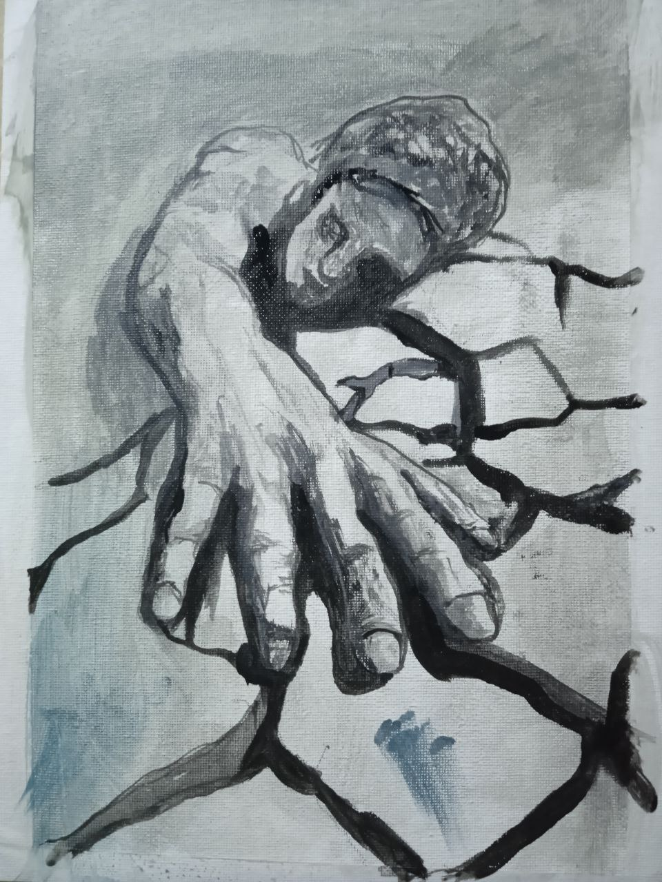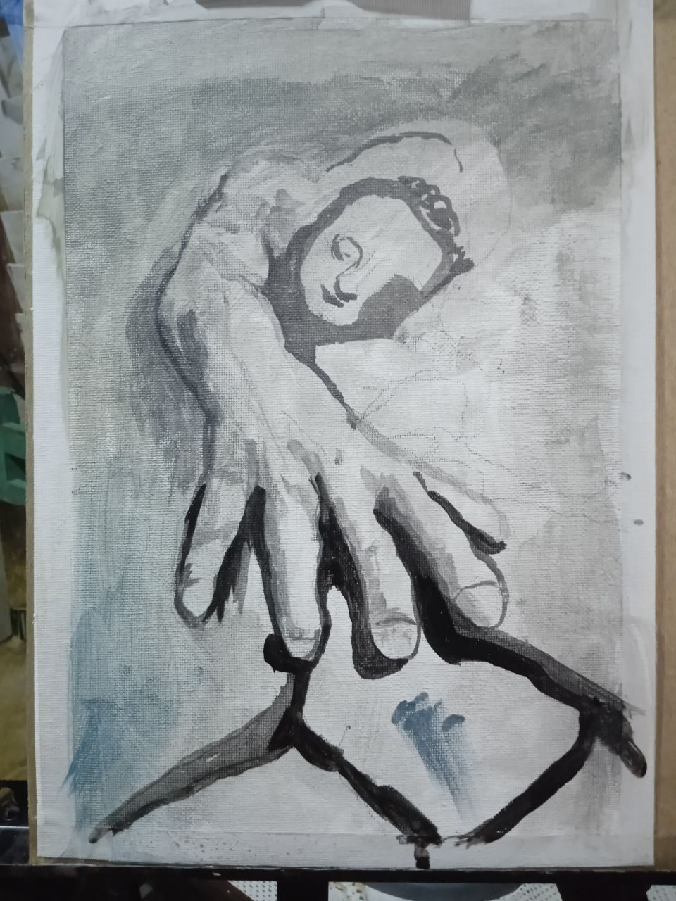 Looking at this type of work, I would say that a person is sleeping soundly... and the hand... as for the hand, it's part of his dream))