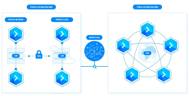 This is a method implemented to transfer load from one Buddy instance to another that is run by users in order to avoid traffic in the network. Shared Automation Grid shares similar properties with the Private Automation GRID. The Shared Automation GRID allows others on the Bubby platform to run some of the instances to manage and reduce resources intensive tasks.