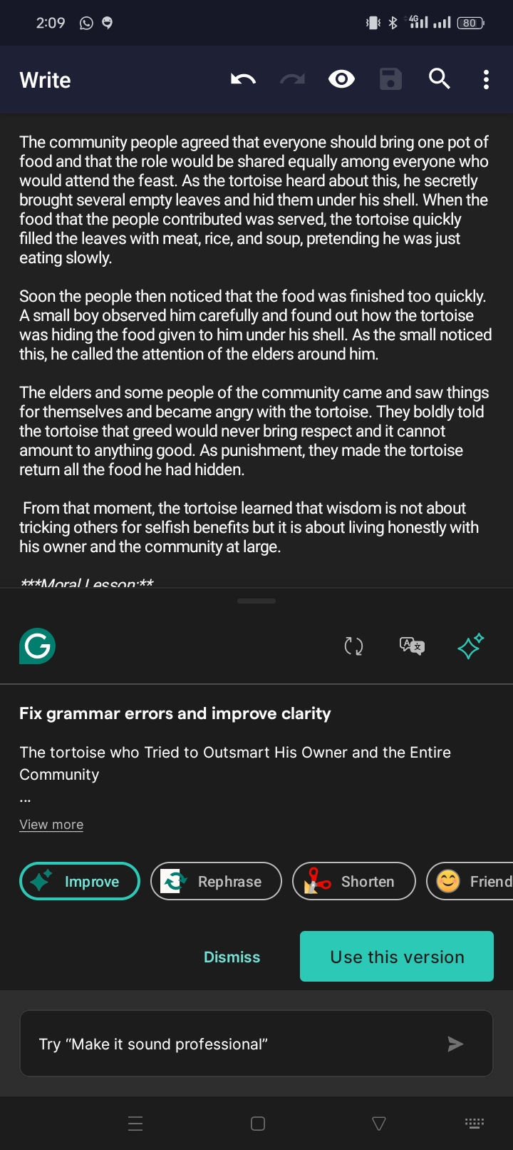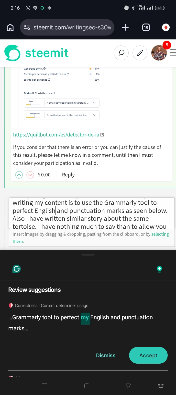 Thank you for your feedback. Honestly, I don't use AI or anything to write my content. What I usually do after writing my content is to use the Grammarly tool to perfect my English and punctuation marks as seen below. Also, I have written a similar story about the same tortoise. I have nothing much to say other than to allow you to grade it as it pleases. Even while trying to respond to you you can see how Grammarly was giving me a suggestion of the words I should use.