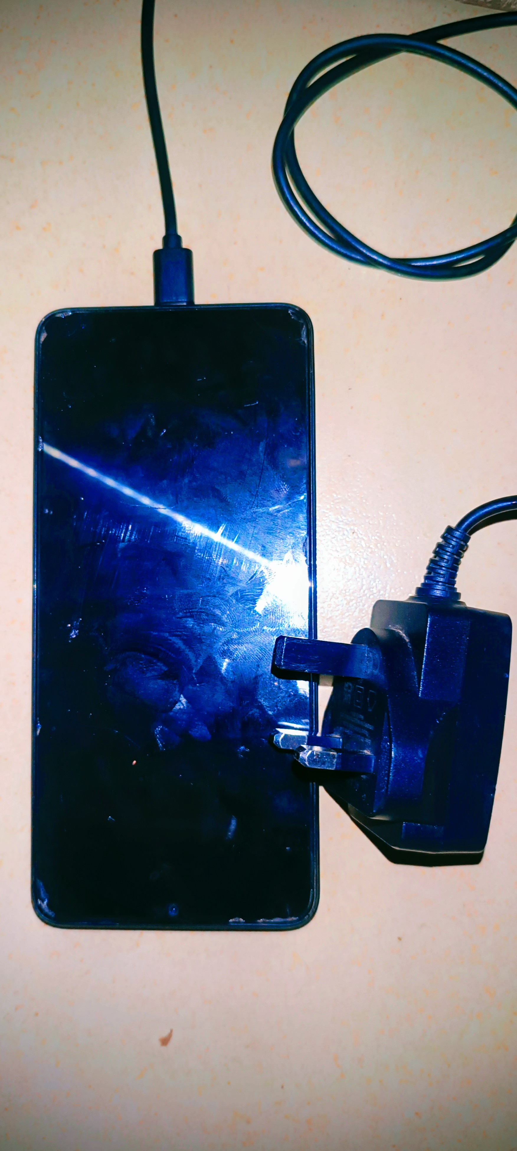 On a small study table, a smartphone lay shining brightly, full of life and energy. Beside it, a simple charger rested quietly.