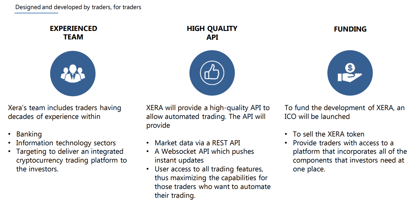 Nhóm XERA bao gồm các nhà giao dịch đã có nhiều thập kỷ kinh nghiệm trong lĩnh vực ngân hàng và công nghệ thông tin. Như vậy, wehave đã xác định các hàm không thể thương lượng trong trao đổi tiền điện tử chất lượng. Nhiều nhà giao dịch hiện phải sử dụng các công cụ của bên thứ ba và các công cụ trả phí khác để thực hiện đầy đủ các yêu cầu giao dịch tiền điện tử của họ thông qua trao đổi. XERA sẽ là một trao đổi cryptocurrencytrading tích hợp đầy đủ giải quyết các vấn đề chính và những thách thức mà các nhà giao dịch đang phải đối mặt với các sàn giao dịch hiện tại. Để tài trợ cho sự phát triển của XERA, một ICO sẽ được tung ra để bán mã XERA và cung cấp cho các nhà giao dịch quyền truy cập vào một nền tảng kết hợp tất cả các thành phần mà các nhà đầu tư cần ở một nơi.