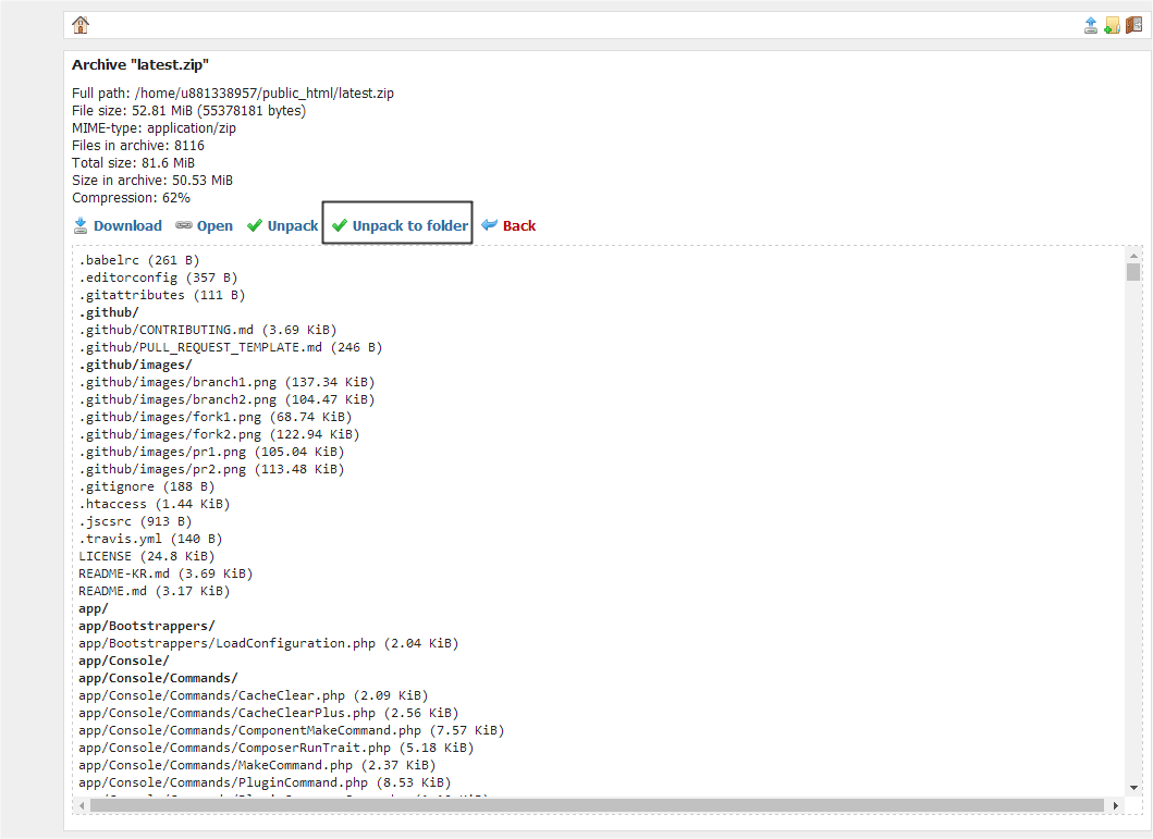 phpfilemanager 에서 업로드한 latest.zip 파일을 선택하여 아래와 같이 Unpack to folder 버튼을 클릭하여 압축을 해제한다.
