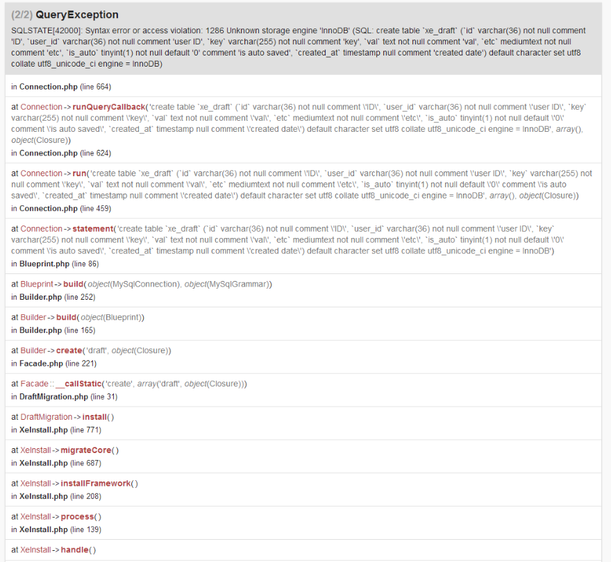 설치시 아래와 같이 오류가 발생하면서 설치가 진행되지 않는다. Hostinger.kr 에서 사용하는 Maria DB가 InnoDB를 지원해 주지 않아 이와 같은 오류가 발생한다. 아래 URL을 참고하여 문제를 해결하였음.
