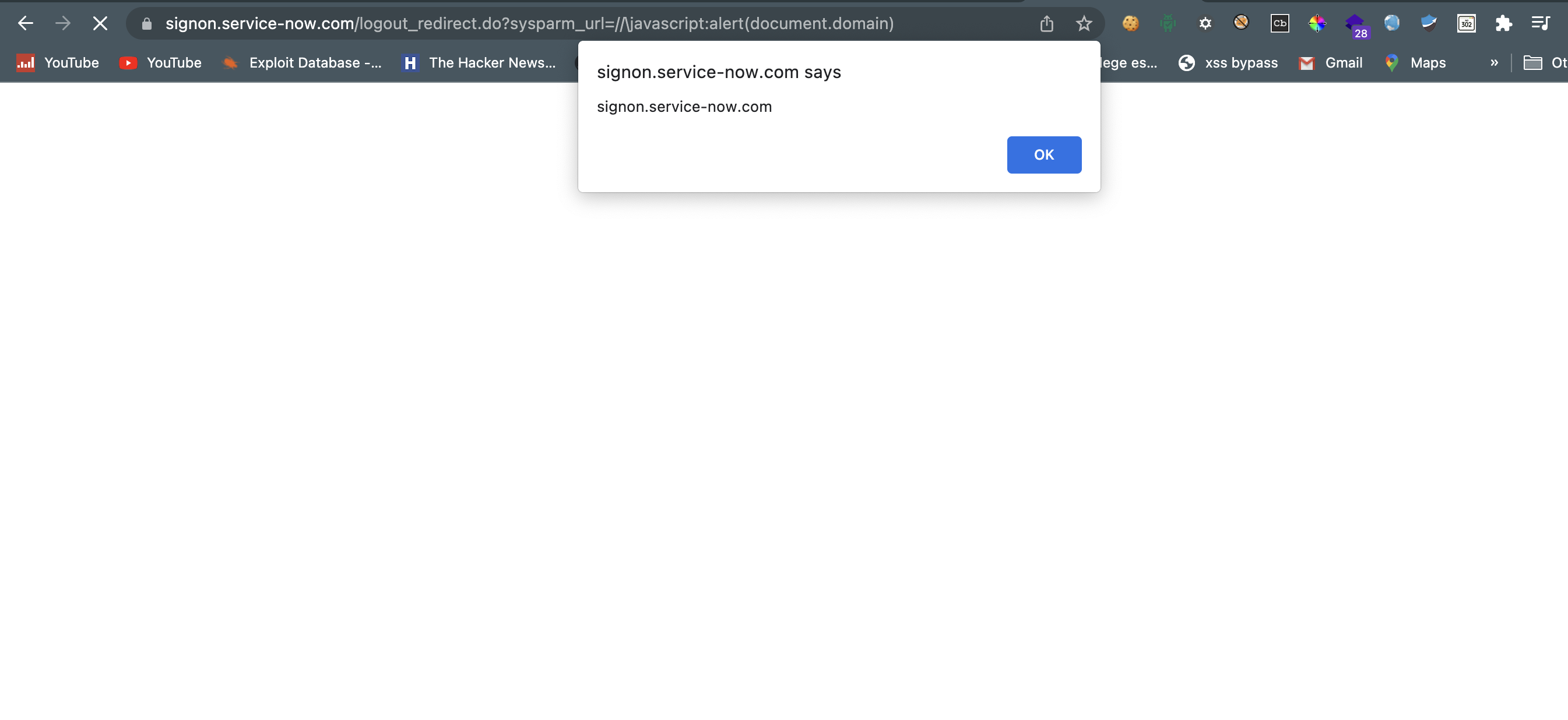 Then I tried to find some more bugs and came to an endpoint /logout_redirect.do. After some testing, I discovered that this endpoint reflects the value of the sysparm_url parameter in response.