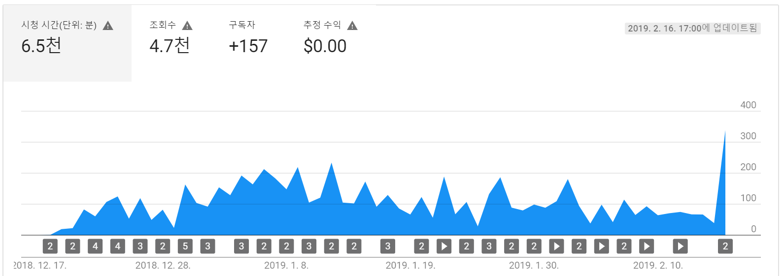 <시청 시간, 2월 16일(54일차 영상 업로드, 유튜브 시작 61일차 시점) 5시 기준>
