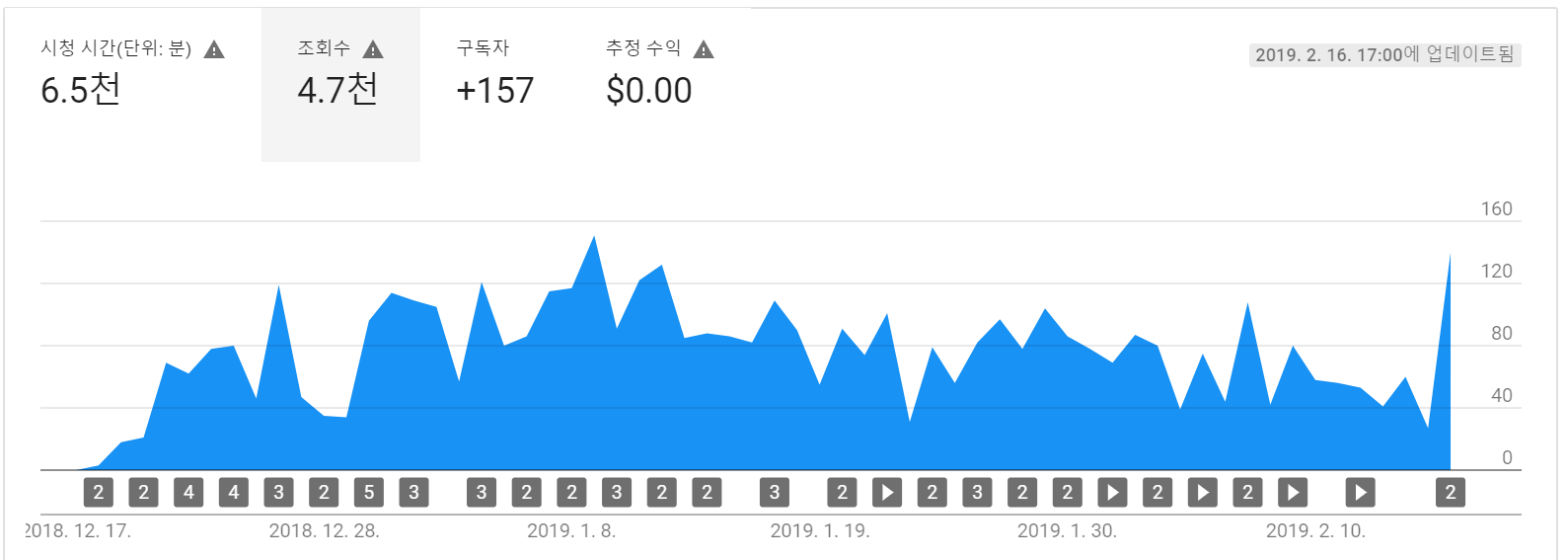 <조회수, 2월 16일(54일차 영상 업로드, 유튜브 시작 61일차 시점) 5시 기준>
