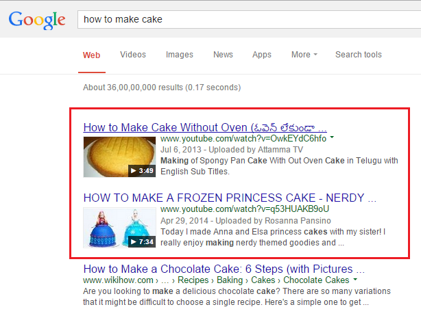 Example: The search result for "how to make bread" in which the top two results are reserved for YouTube videos