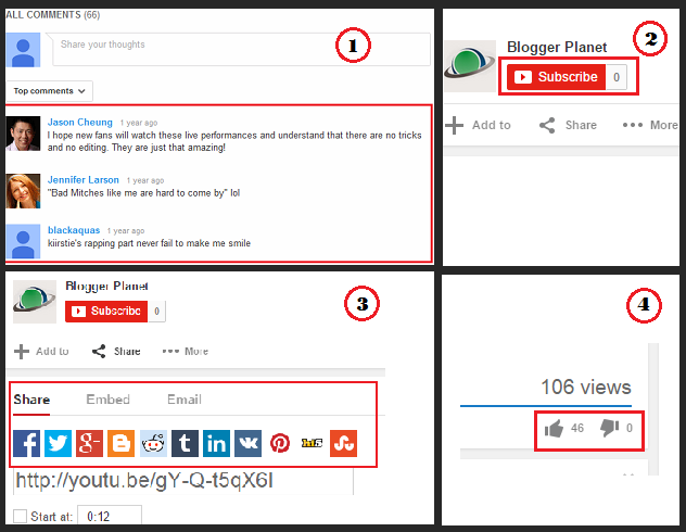 3. Shares: How many people share your videos on social media sites like Twitter Google+,Facebook.