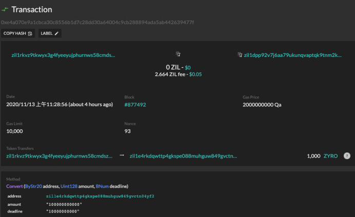 The actual APY depends on pool size. Given the numbers on convert portal, 2.6M zyro has been converted from ERC20 format to ZRC2 format, which is total circulation of zyro on zilliqa chain. Lets assume the 25% of the circulation will stake in liquidity mining. (same proportion as zillion staking participation) according to the tokenomics, close to 20K zyro will be mined each day from the liquidation providing pool, that’s 1.5% each day, 562% APY, not mentioning that