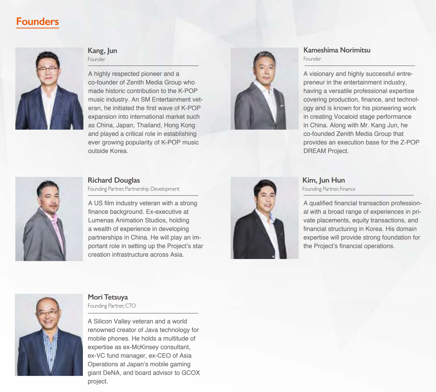 Mr. Kang and Mr. Kameshima has established Zenith Media Group in Hong Kong and Zenith Media Contents (http://www.zmcie.com/) in Korea, offering K-POP news media (http: //www.zenithnews .com /), talent management, and merchandising creation and distribution in the past 6 years. This entity will provide a strong base of business execution for the Z-POP IMP Project.