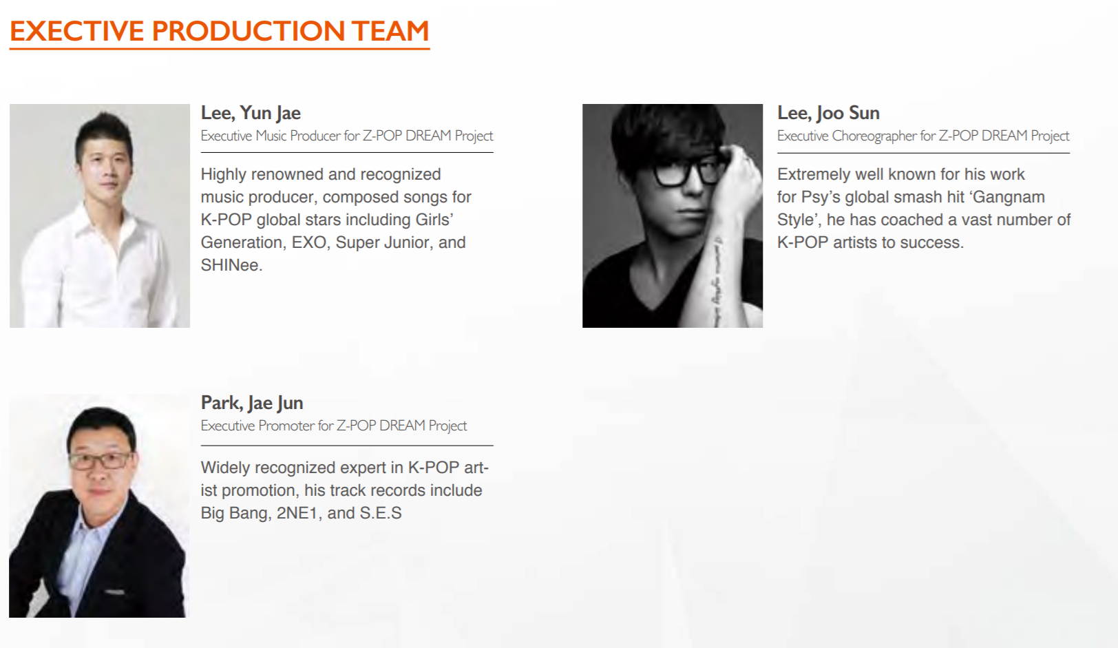 Key personnel behind the Z-POP DREAM Project including the founders are well-known professional production specialists and music promoters. From the early days of K-POP, they have contributed to the creation of legends such as Psy, Boa, TVXQ, Super Junior, Girls' Generation, Big Bang, 2NE1, EXO, BTS, and Wanna One. The Z-POP DREAM Project continues to add esteemed production professionals to groups that are already strong.