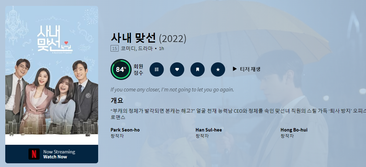 전 로맨틱 작품을 좋아하지 않지만 넷플릭스에서 상위에 랭크 되어있다고 합니다