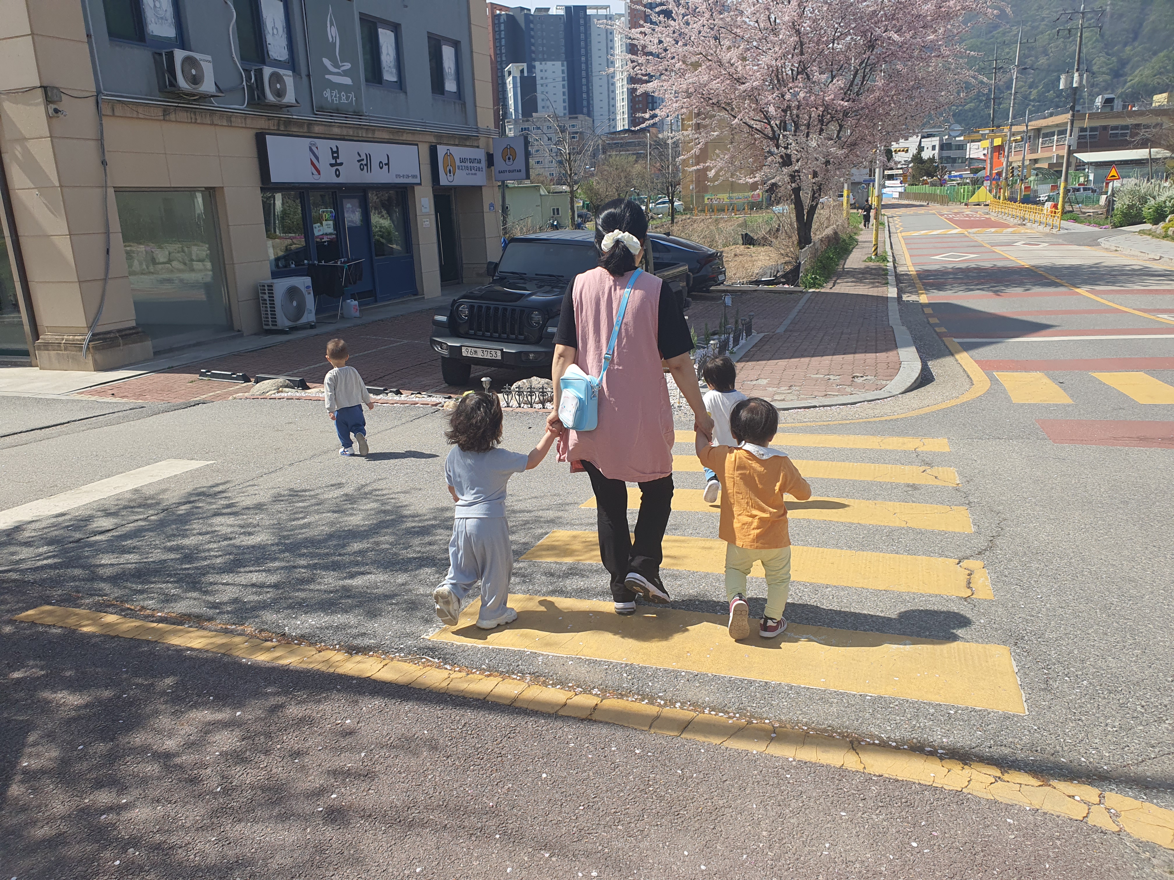그런데 아이들 제멋대로 걸어 길가 위험하니