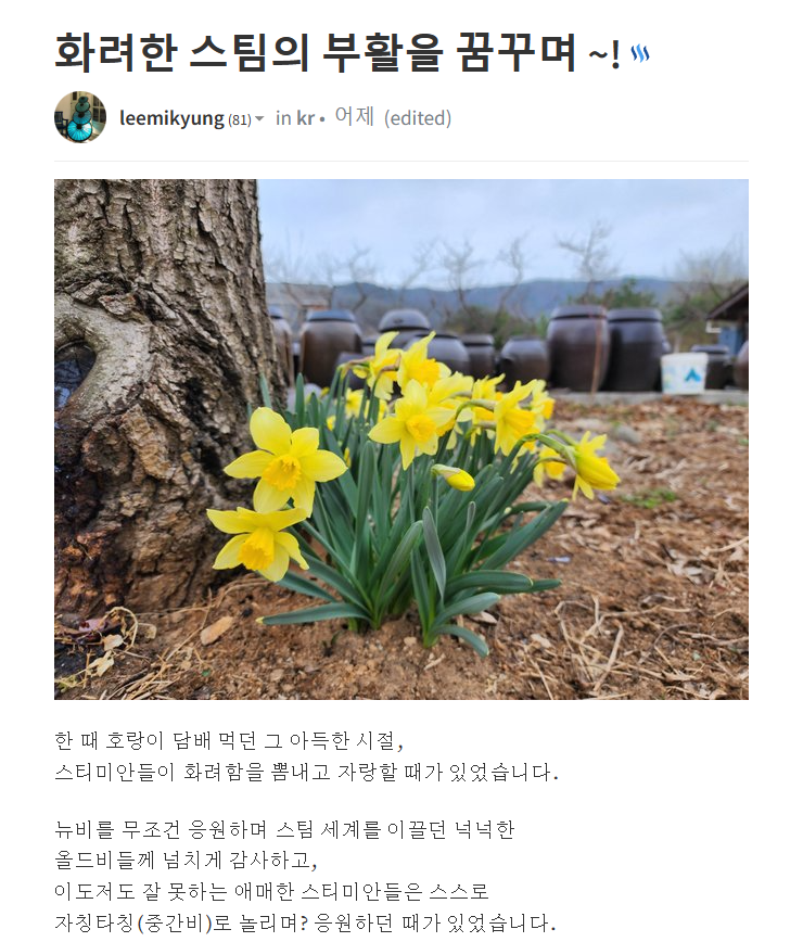 이런저런 이야기가 많아도 스팀은 스스로 자정능력이나 자생력이 그 어느 코인, 블록체인보다 뛰어나다고 본다.