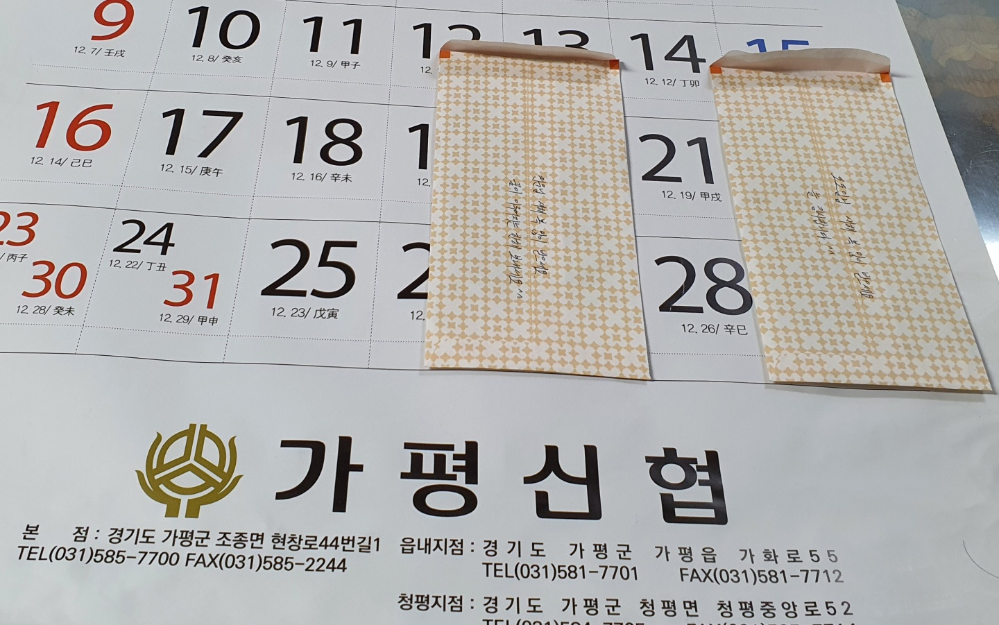 뭐 우리 동네 새로 건물 져서 지점을 오픈한 가평 신협 청평지점 홍보 좀 할 겸 위 사진에 가평 신협이 잘 나오게 찍은 사진이고 아래 사진은 설 선물로 주고 간 봉투에 손글씨가 잘 보이게 찍은 사진입니다.