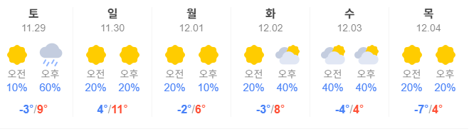 12월 초하루부터의 한파는 15월 첫 주말에는 한겨울 기온인 영하 7도 이하로 끌어내릴 모양이다.