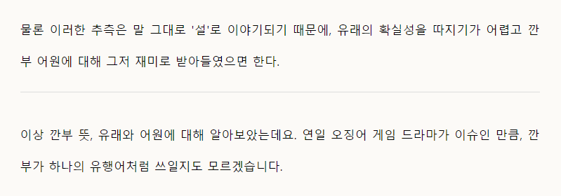 저도 오징어 게임에서 깐부라는 표현을 처음 들었어요. 저희 동네는 없었던 표현이죠. 깍두기는 있었구요. ㅎㅎ