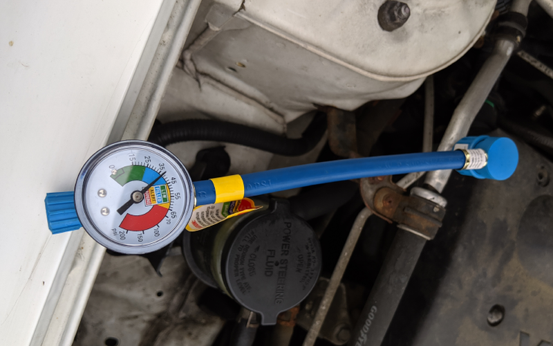 주입 전에 압력을 재어 보는데, (에어컨을 틀어서 컴프레서가 작동 중일 때의 압력을 봐야 합니다)