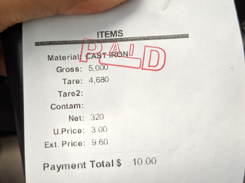 여기서 일의 처리는 이런 식으로 이뤄집니다. 먼저 차의 무게를 재는 곳을 통과합니다. 무게를 재면서 어떤 금속을 가져왔냐, 모두 몇 종류냐 등을 묻습니다. 저는 무쇠 (Cast Iron) 한 종류이기 때문에 간단합니다. 무게를 잰 후 지정된 장소에 가서 싣고온 무쇠 덩어리들을 내려놓습니다. 내려 놓으며 거기 직원에게 사인 받은 후에, 다시 아까 그 무게 재는 곳으로 가서 무게를 또 잽니다. 그 차이만큼의 고철을 가져온 걸로 계산하는 거죠. 이후 무게가 적힌 영수증을 들고 사무실로 가서 환전하면 끝입니다.