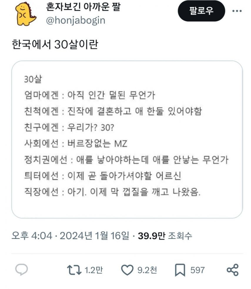 #30살 #30YearsOld #엄마에겐아직인간덜된무언가 #친척에겐진작에결혼하고애한둘있어야함 #친구에겐우리가30이거레알실화냐 #사회에선버르장머리없는MZ #정치권에선애를낳아야하는데애를안낳는무언가 #트위터에선이제곧돌아가셔야할어르신 #직장에선이제막껍질을깨고나온아기 #카카오톡에선쉰내나는영포티예정자 #30대아재들와이셔츠단추 #1개를풀면지성 #2개를풀면개성 #3개를풀면야성 #4개를풀면실성 #5개를풀면반성 #자매품 #개발자의30대업데이트내역