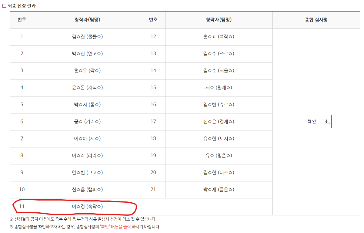 점심시간이 되어 밀린 문자와 톡을 확인하는데, 콘텐츠 진흥원에서 축하 메시지가 도착해있었습니다. 최종평가 합격 메시지였어요. 바로 아내에게 연락해줬고요. 홈페이지에 들어가서 확인해 보니 명단에 저희 팀이 뙇!! 나와있더라고요. ^^