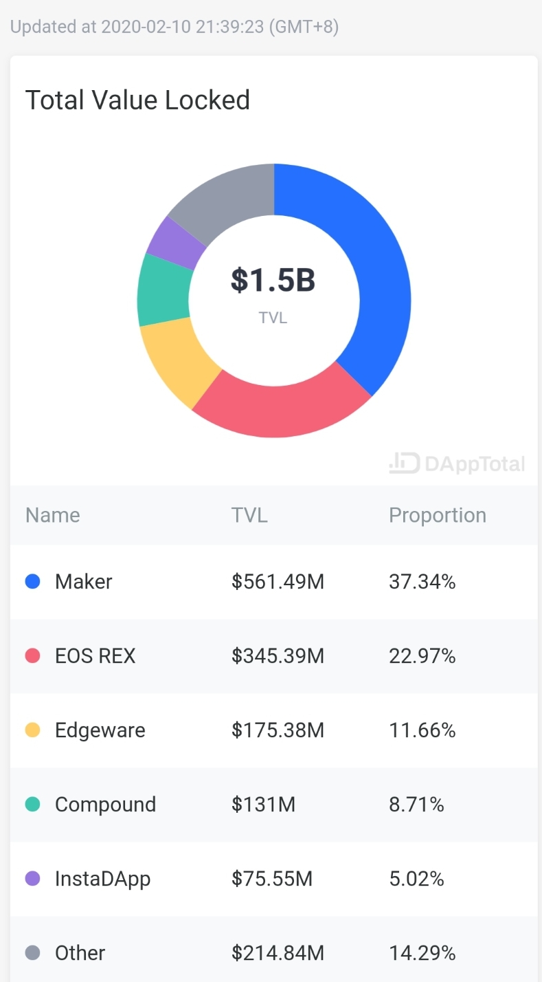 메이커 다오에 예치된 자산은 5.61억 달러 규모로 전체 DeFi 예치금의 37.34%를, EOSREX에 예치된 자산은 3.45억 달러 규모로 전체의 22.97%를 점유했습니다.